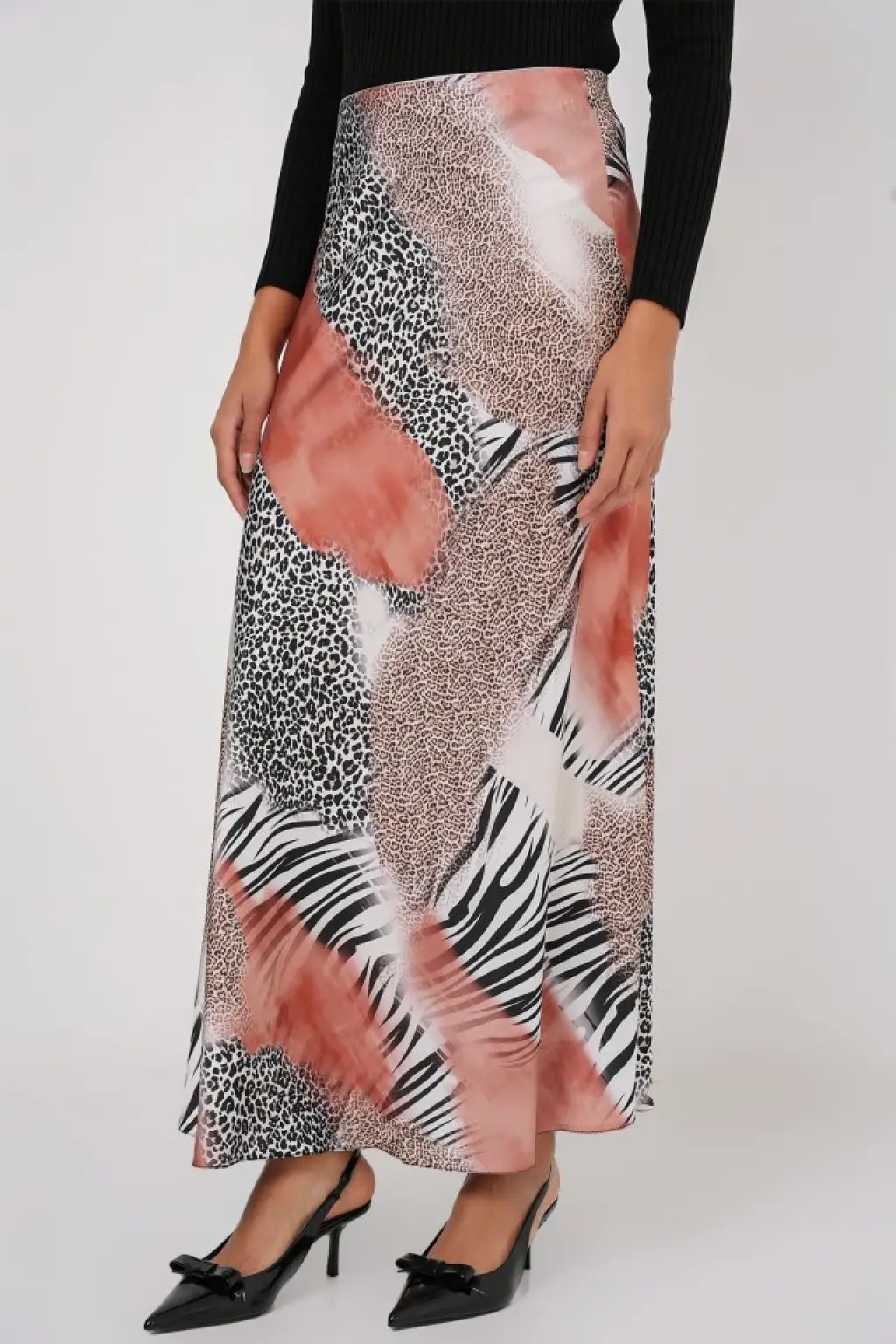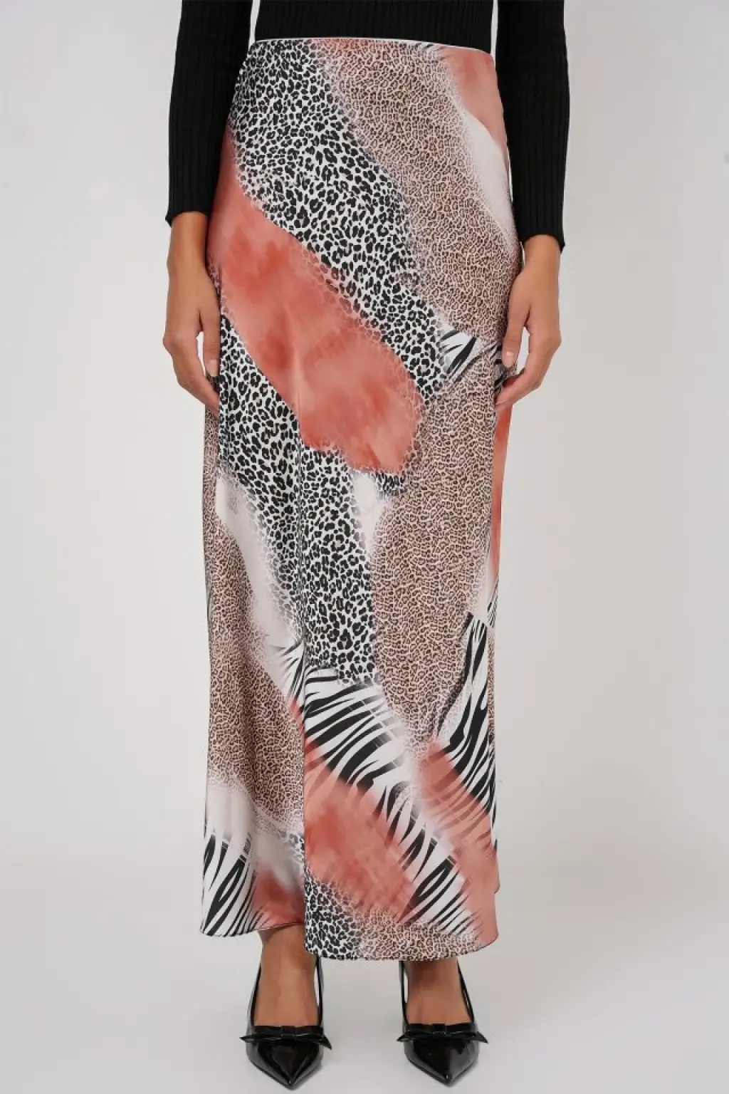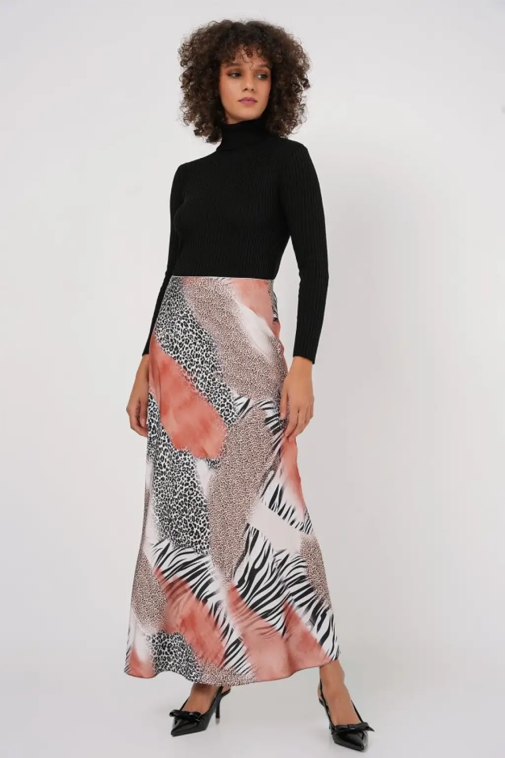 Kadın Beli Büzgülü Yandan Yırtmaçlı Desenli Süprem Etek