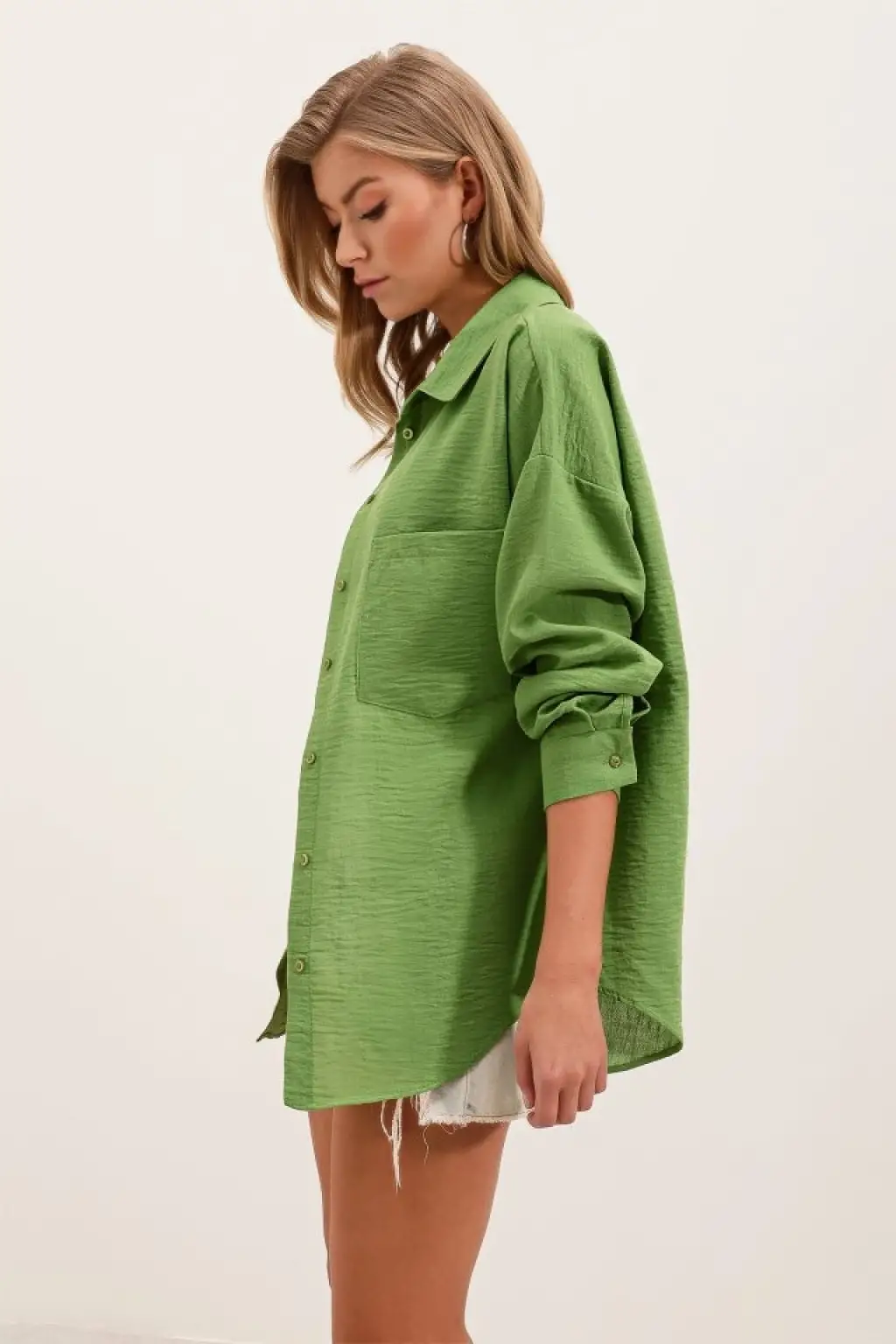 20153 Tek Cepli Oversize Keten Gömlek - G.Yeşil