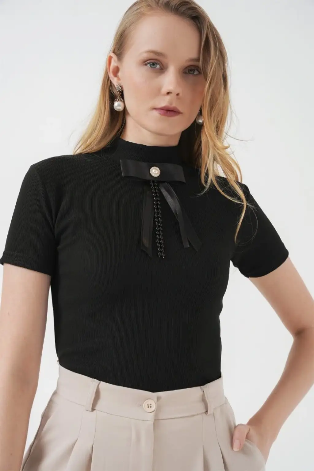 926 Yaka Detaylı Kısa Kol Bluz - Siyah