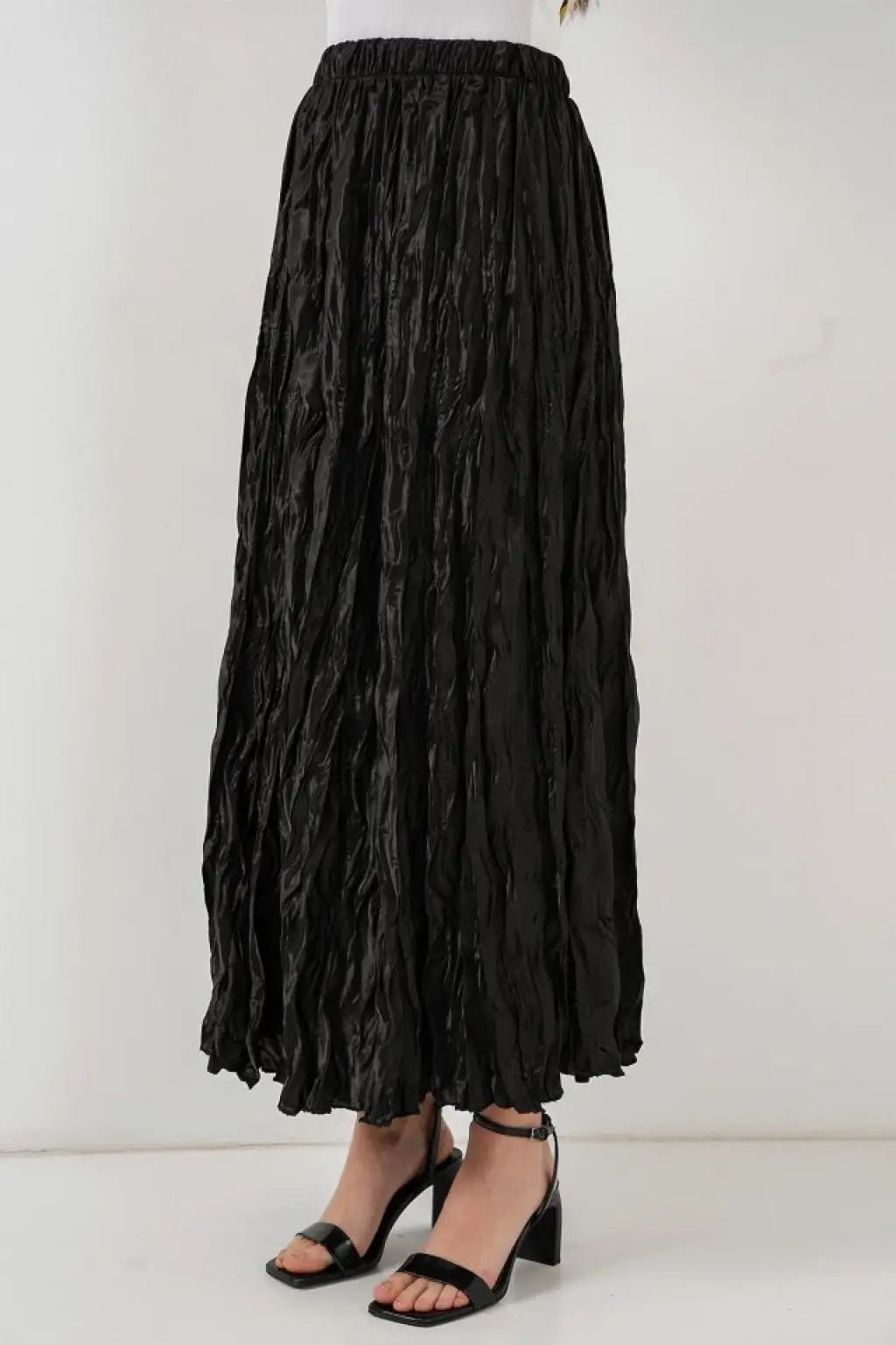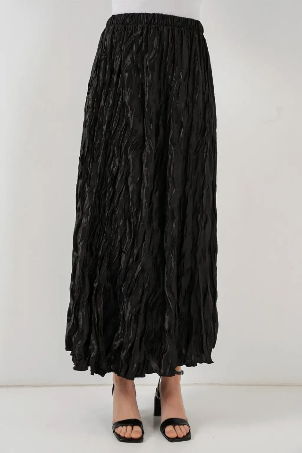 Uzun Kırışık Parlak Etek 8034 - Siyah