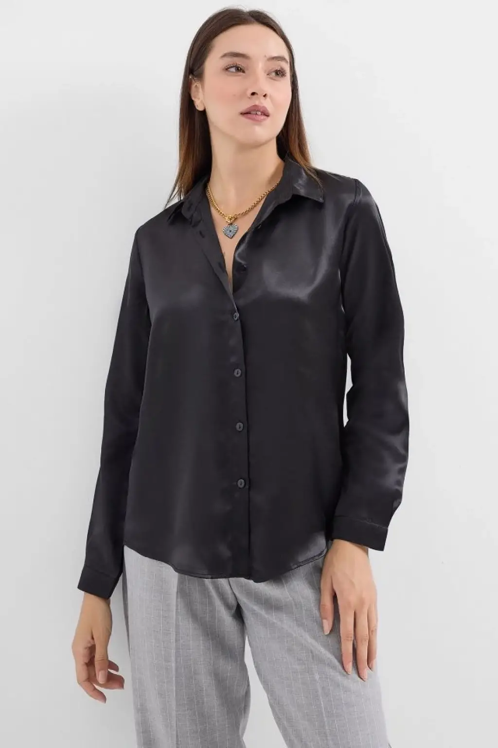 3964 Hafif Dökümlü Saten Gömlek - Siyah