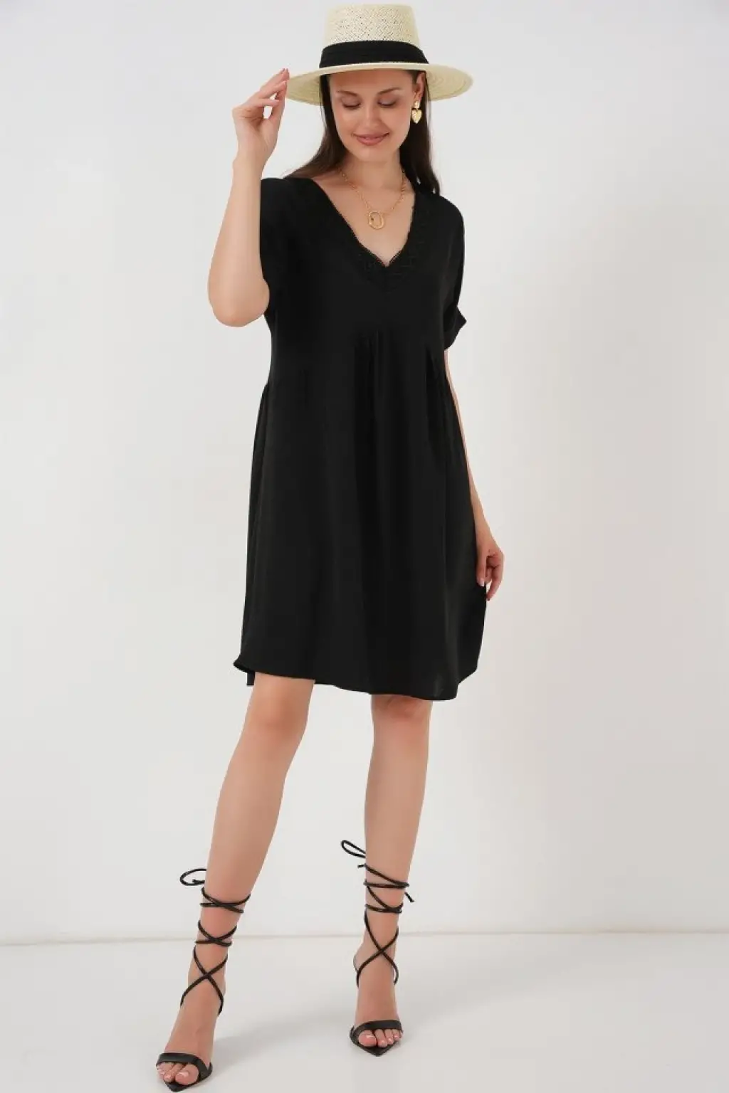 V Yaka Kısa Kol Elbise 2567 - Siyah