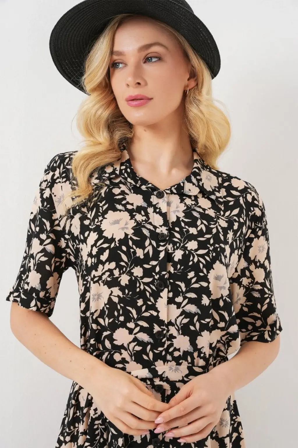 Kısa Kol Desenli Elbise 2560 - Siyah