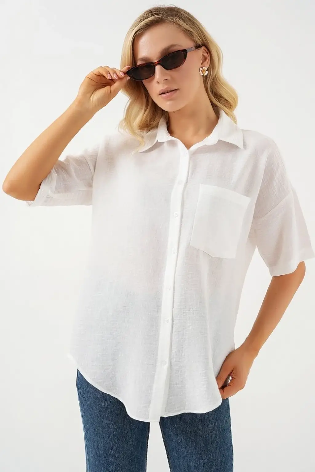 20153 Tek Cepli Oversize Keten Gömlek - Buz Mavi