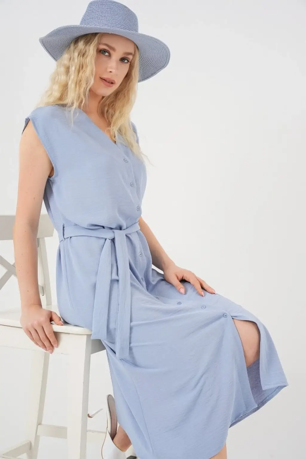 Sıfır Kol Kuşaklı Ayrobin Elbise 2568 - Mavi