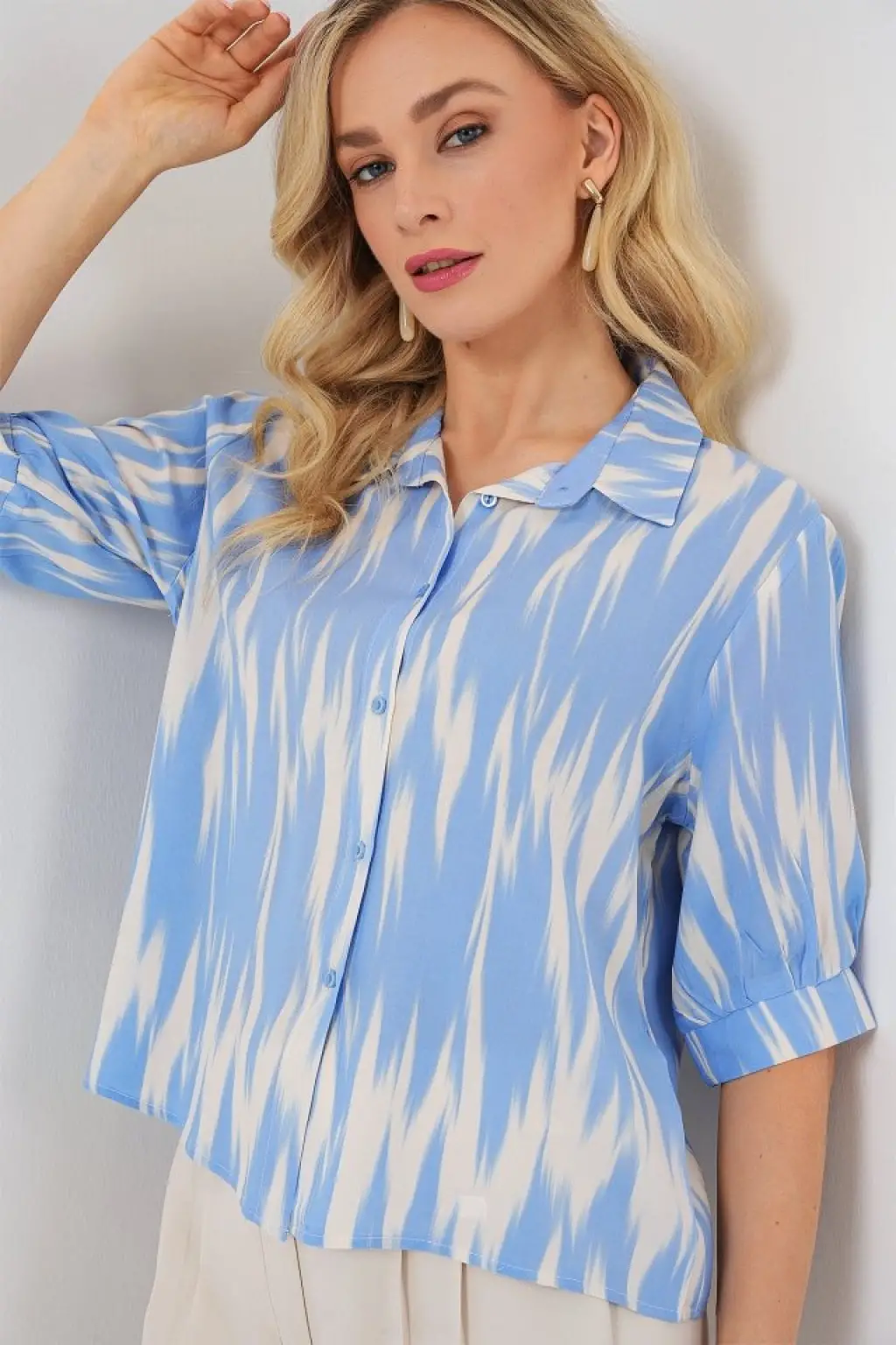 Desenli Kısa Kol Crop Gömlek 20337 - Mavi