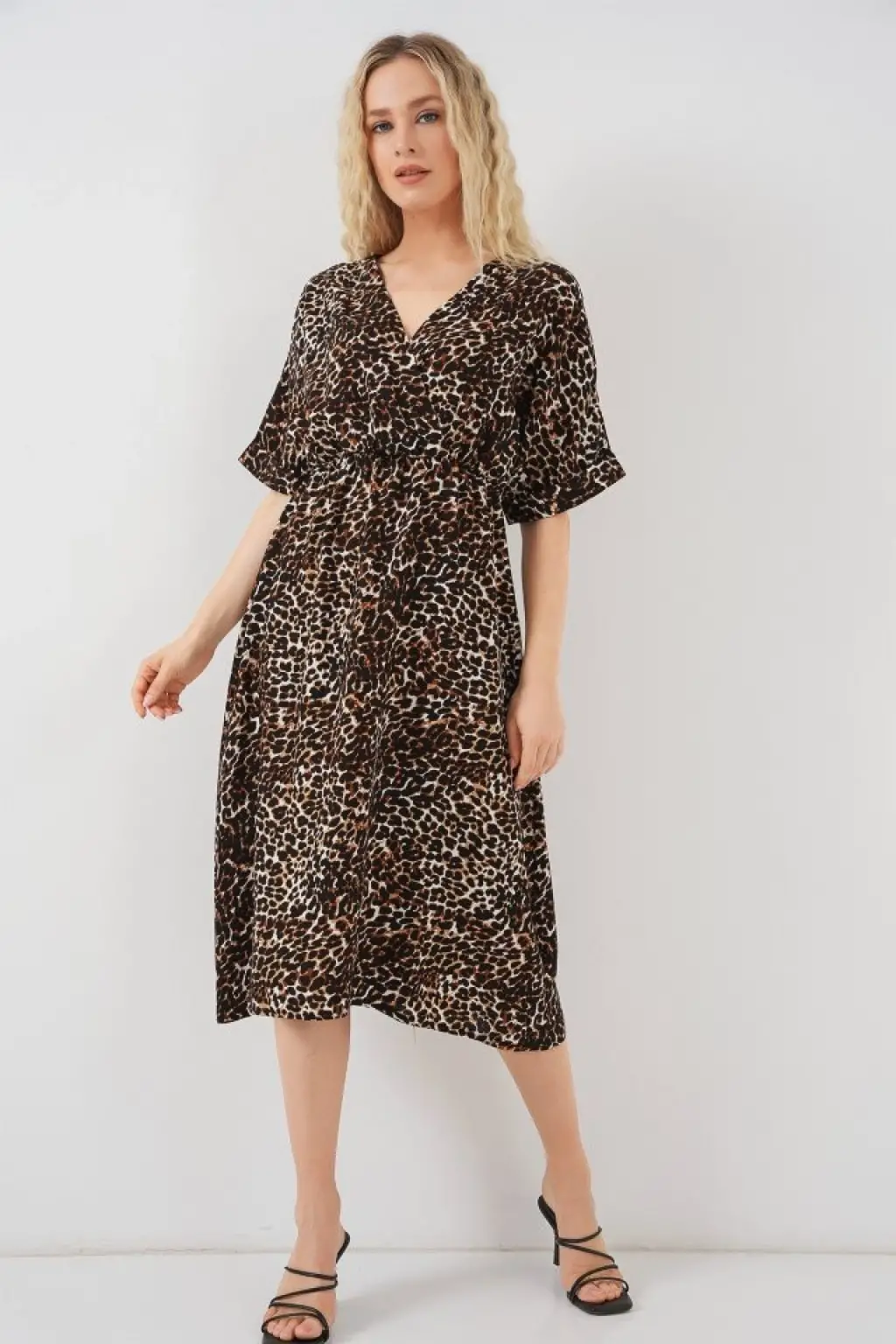 Desenli Kısa Kol Elbise 2569 - C. Kahverengi