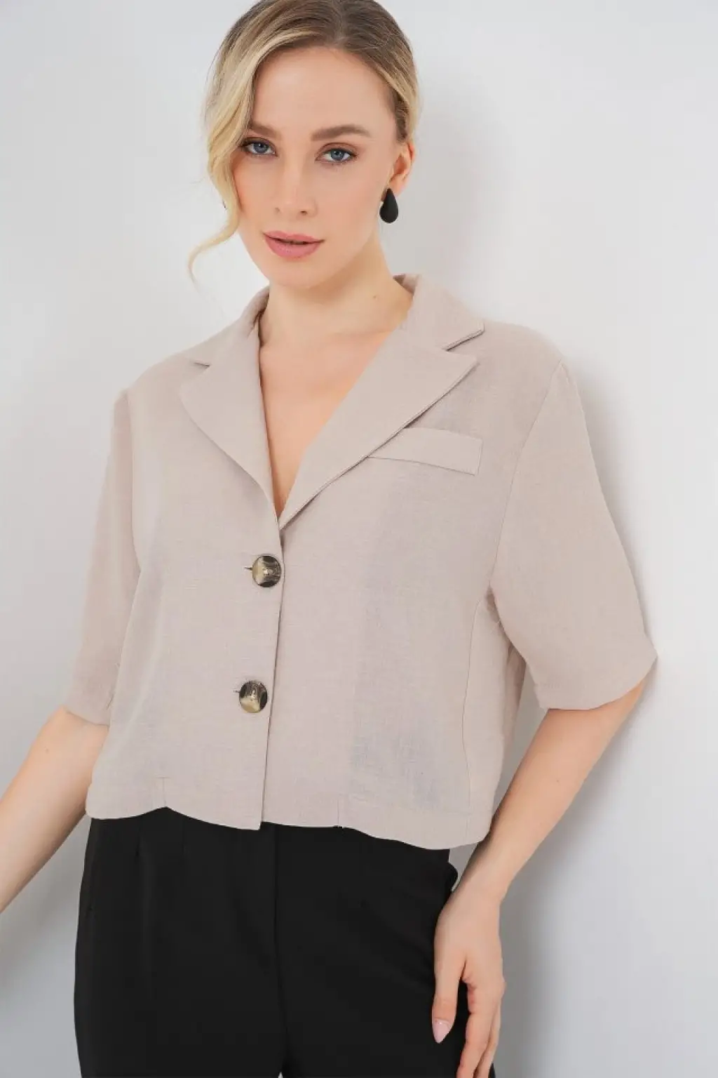 Crop Yakalı Gömlek Üç Çeyrek Sleeve Kol - Beyaz