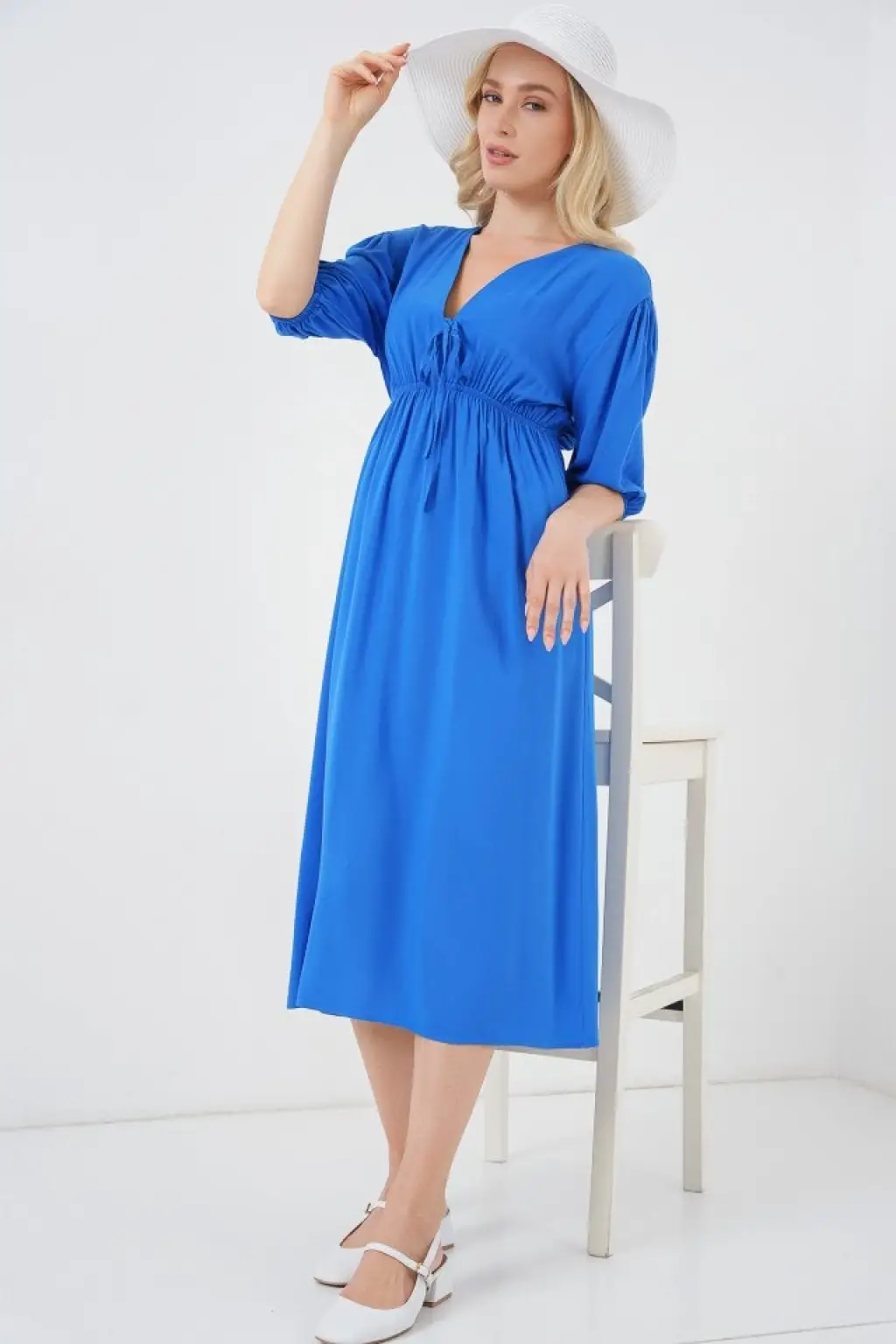 2570 Beli Büzgülü V Yaka Elbise - Saks