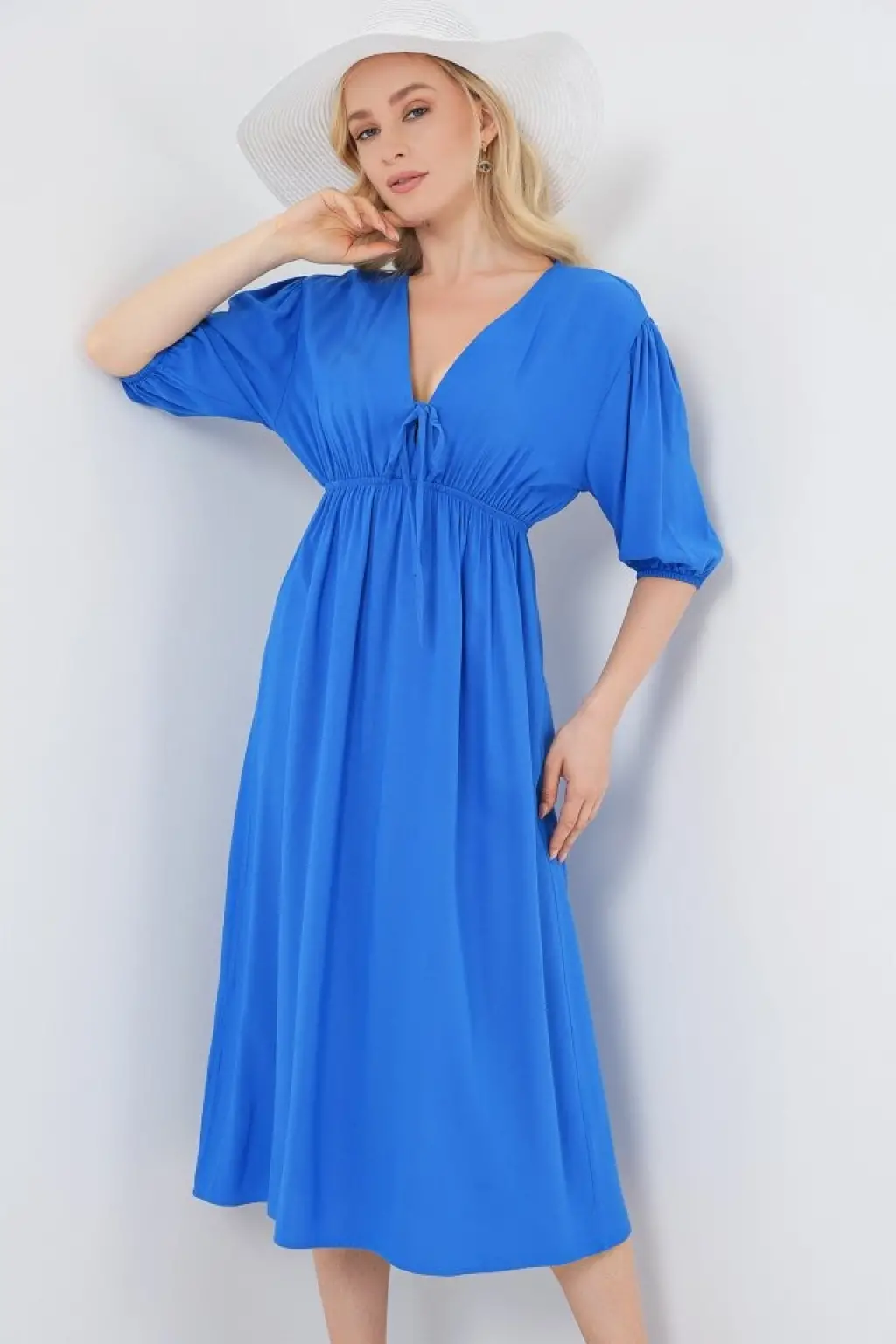 Kadın Kısa Kollu V Yakalı Yırtmaçlı Midi Viskon Elbise