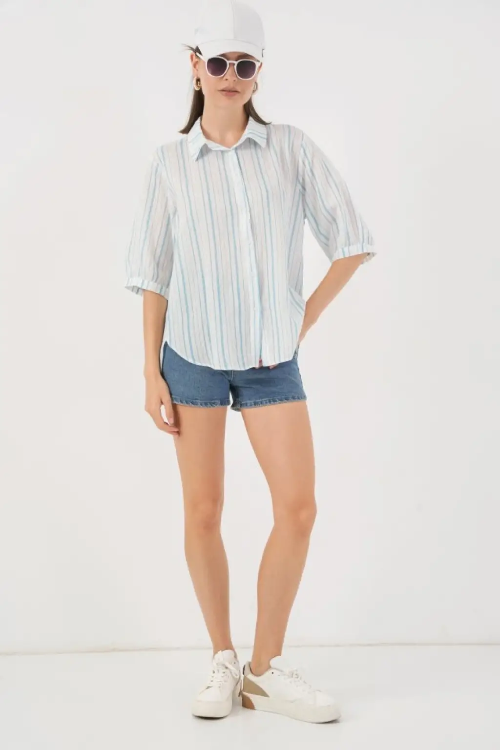 Kadın Uzun Kollu Salaş Gömlek Ve şort Keten Ikili Takım