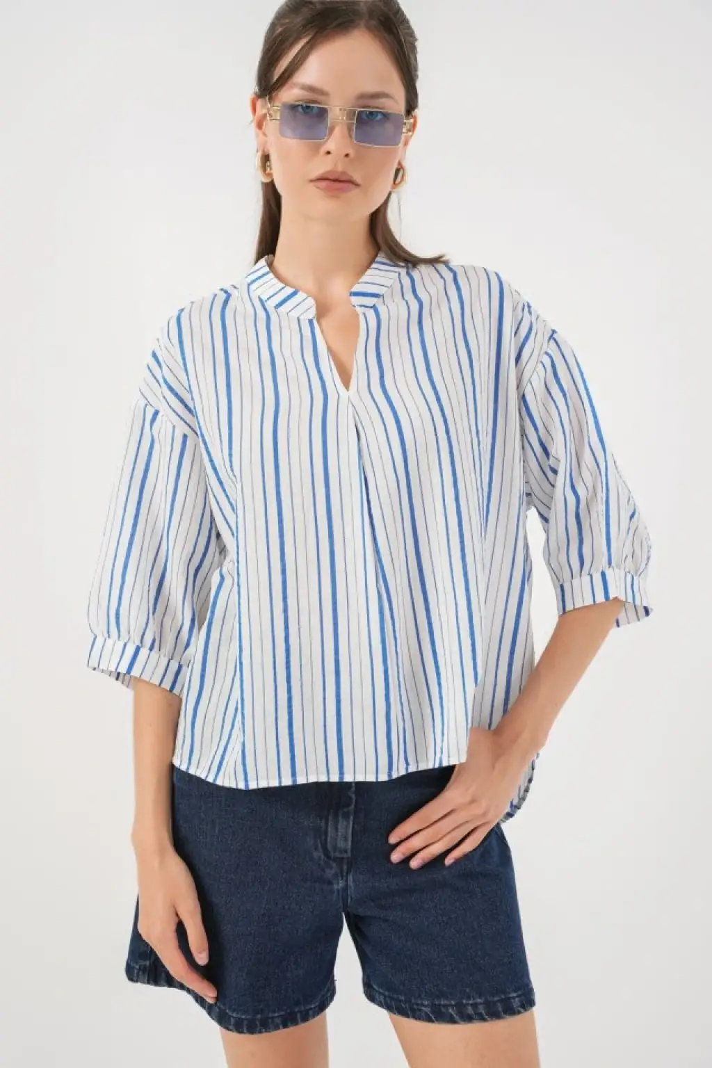 KOL VE MANŞET BEYAZ KAPALI PİLE DETAYLI GÖMLEK - Mavi