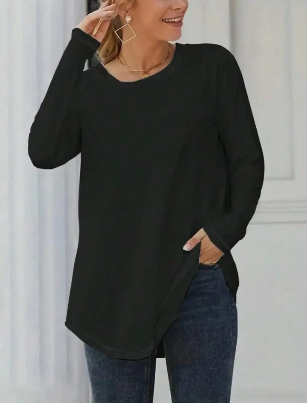 Kadın Uzun Kollu Yuvarlak Yaka Salaş Iki Iplik Bluz
