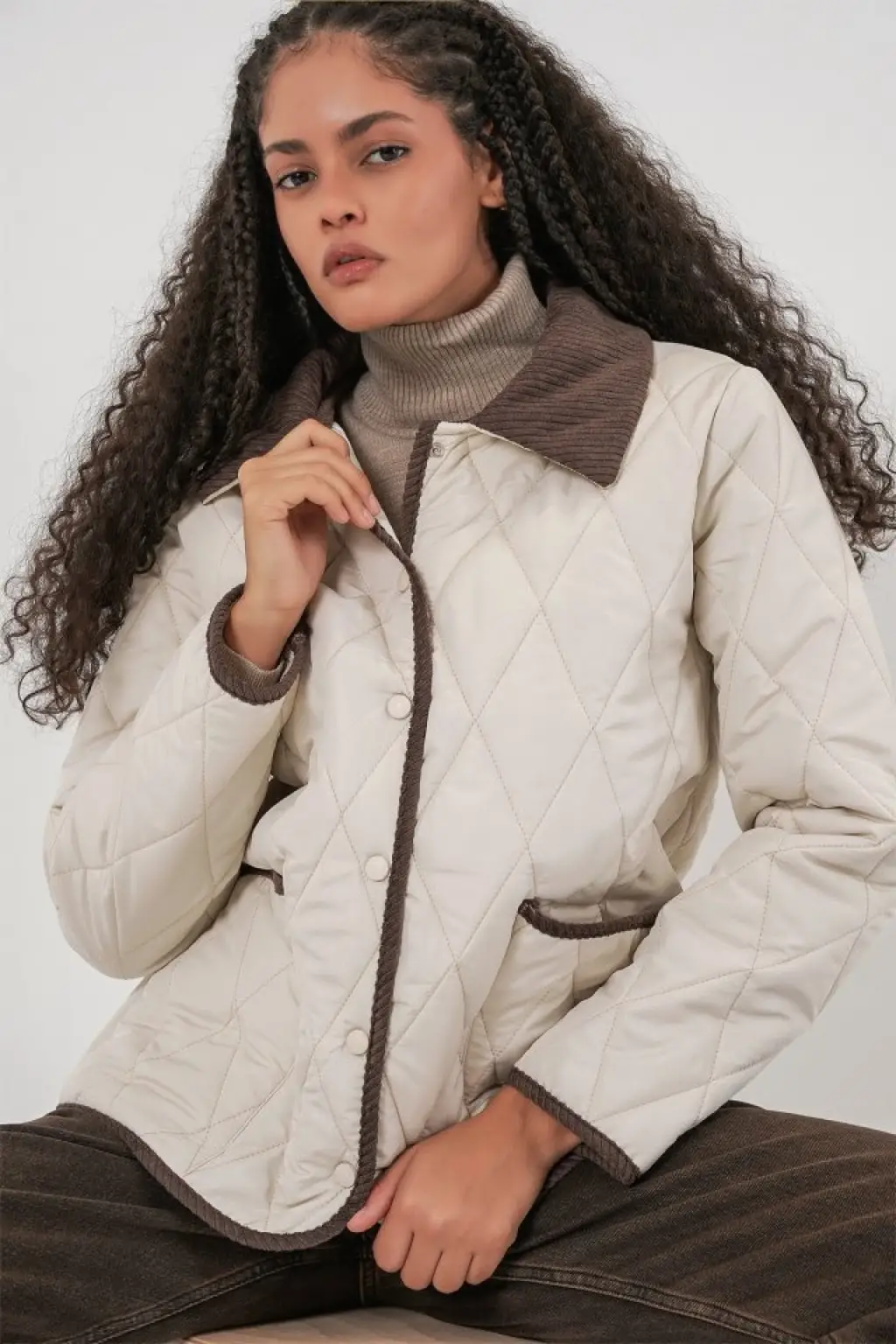 Ekru Kahve Kapitone Oversize Mont Kadın Giyim