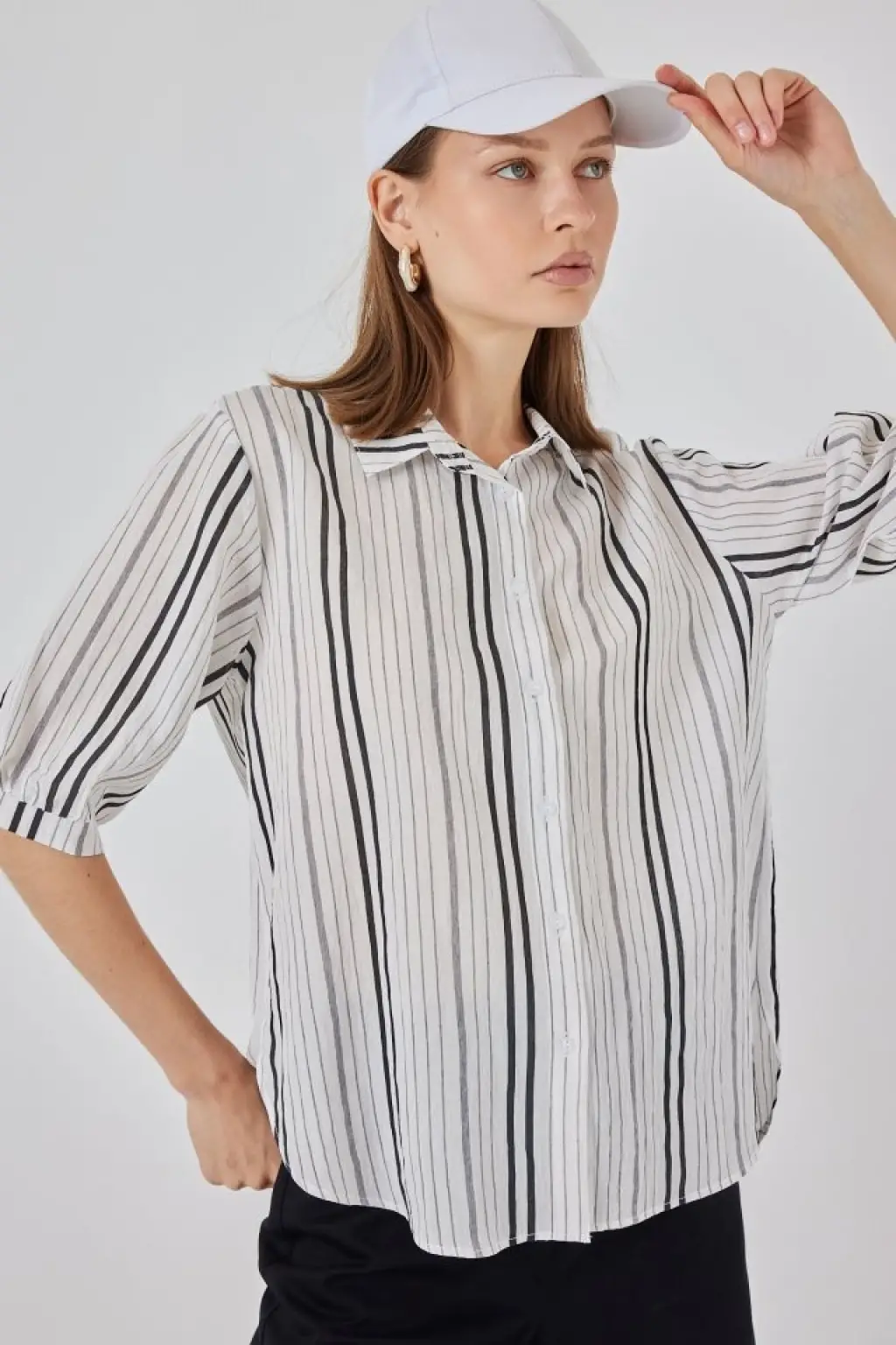 Çizgili Oversize Gömlek 20293 - E.Yeşil
