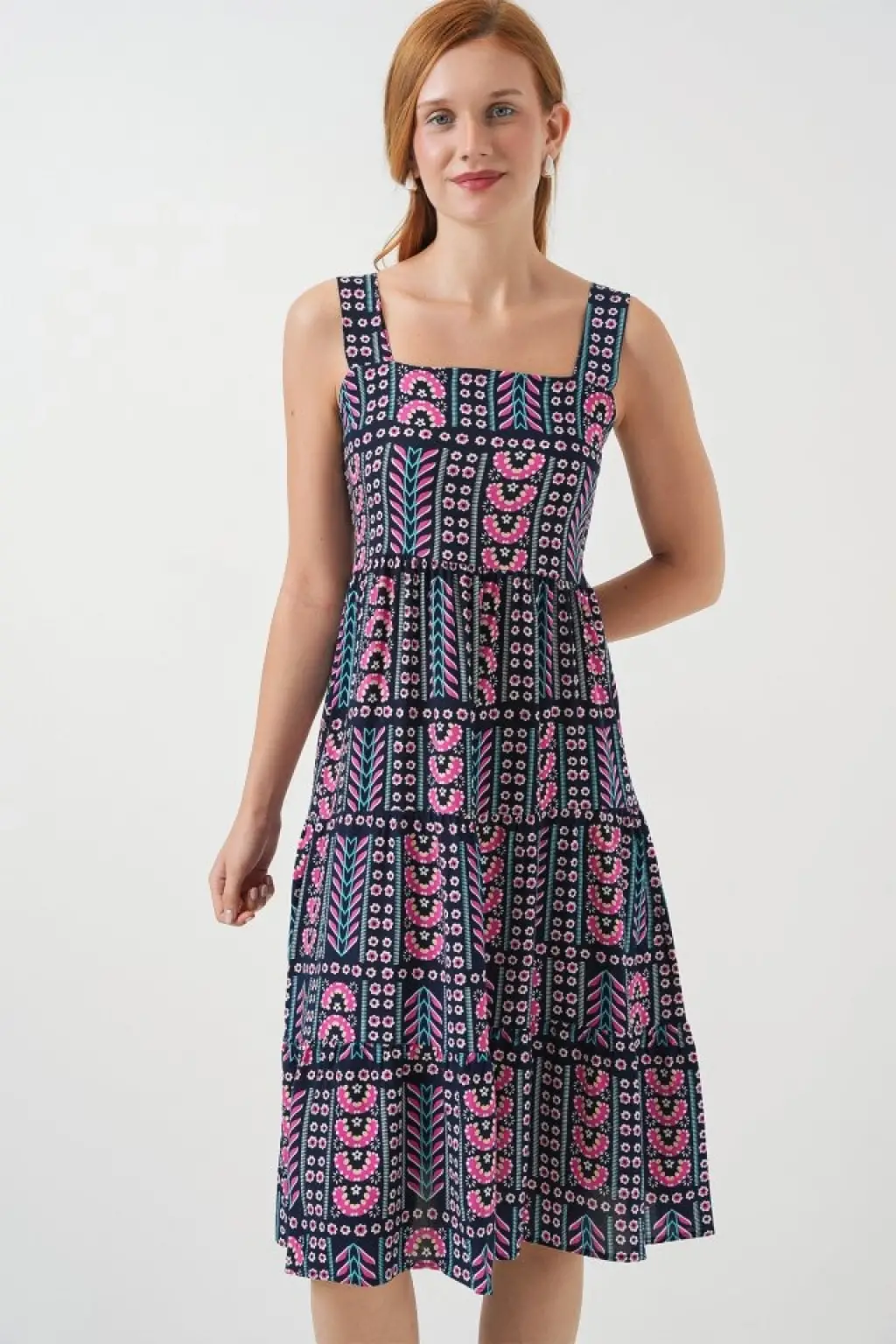 Desenli Askılı Midi Elbise 2577 - Lacivert