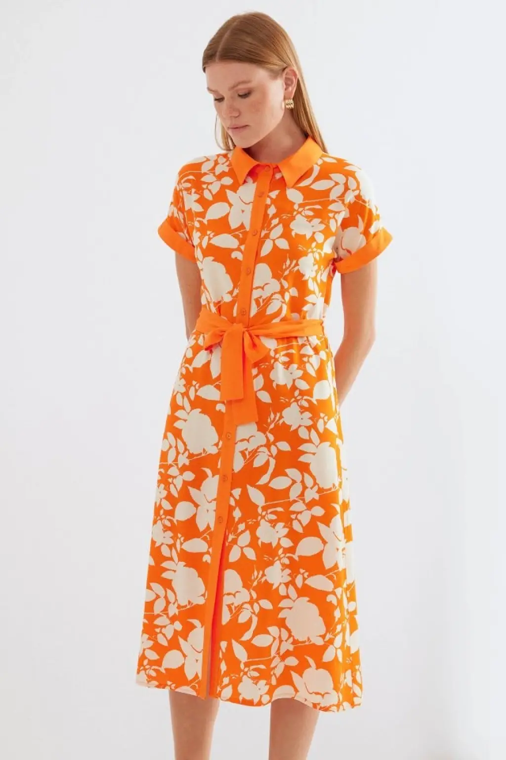 2455 Desenli Gömlek Elbise - Turuncu