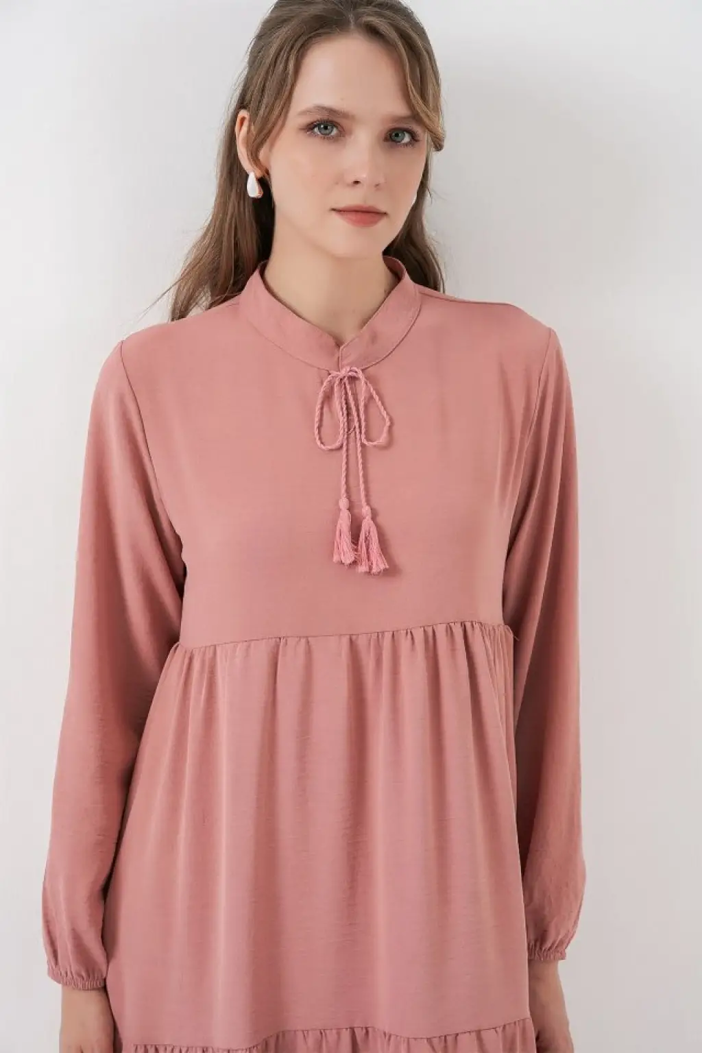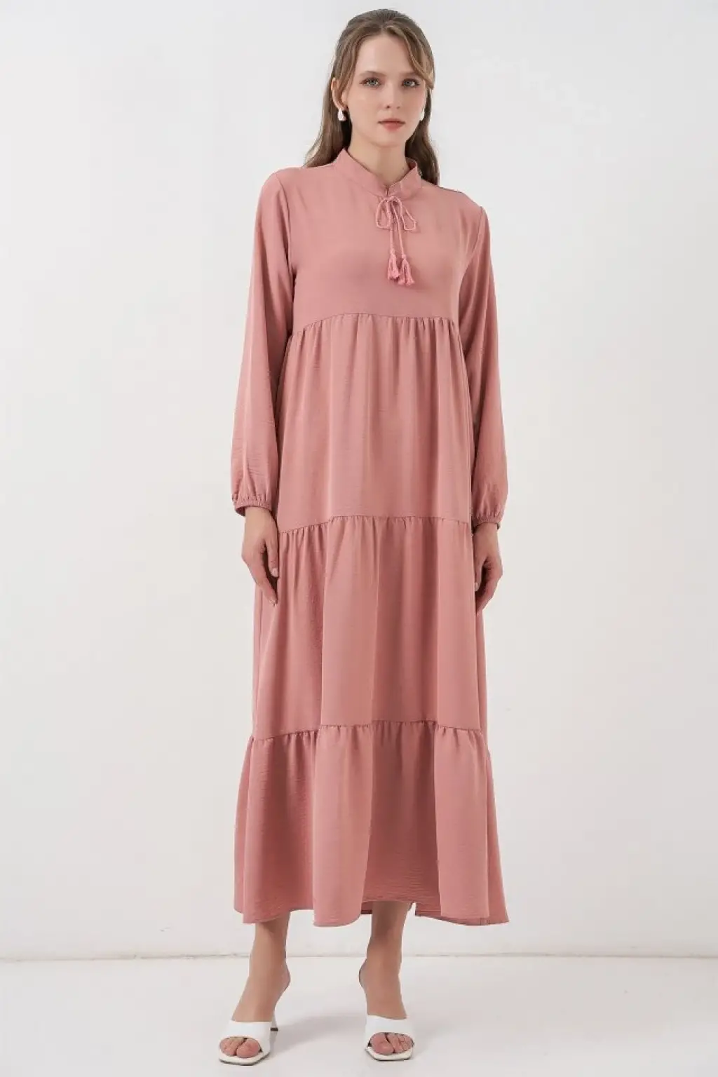 T1627 Yaka Bağcıklı Elbise - Pudra