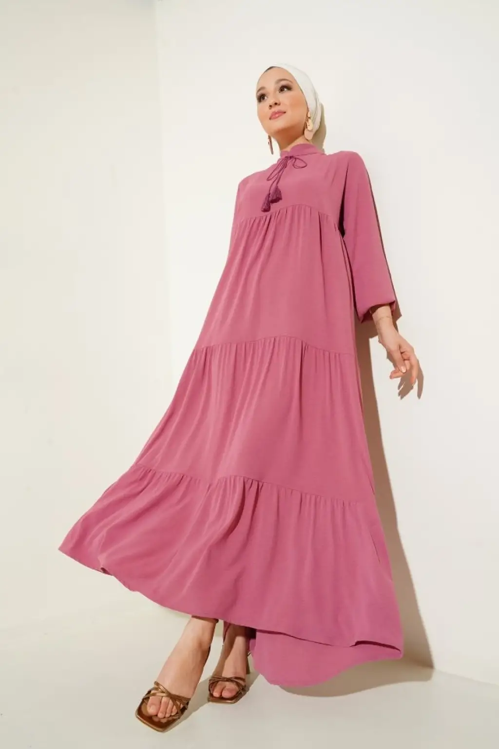 T1627 Yaka Bağcıklı Elbise - A. Pembe