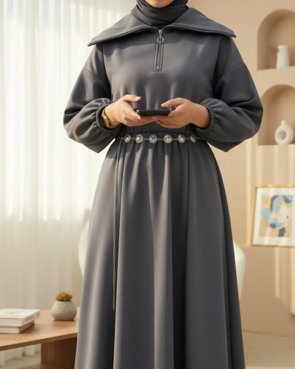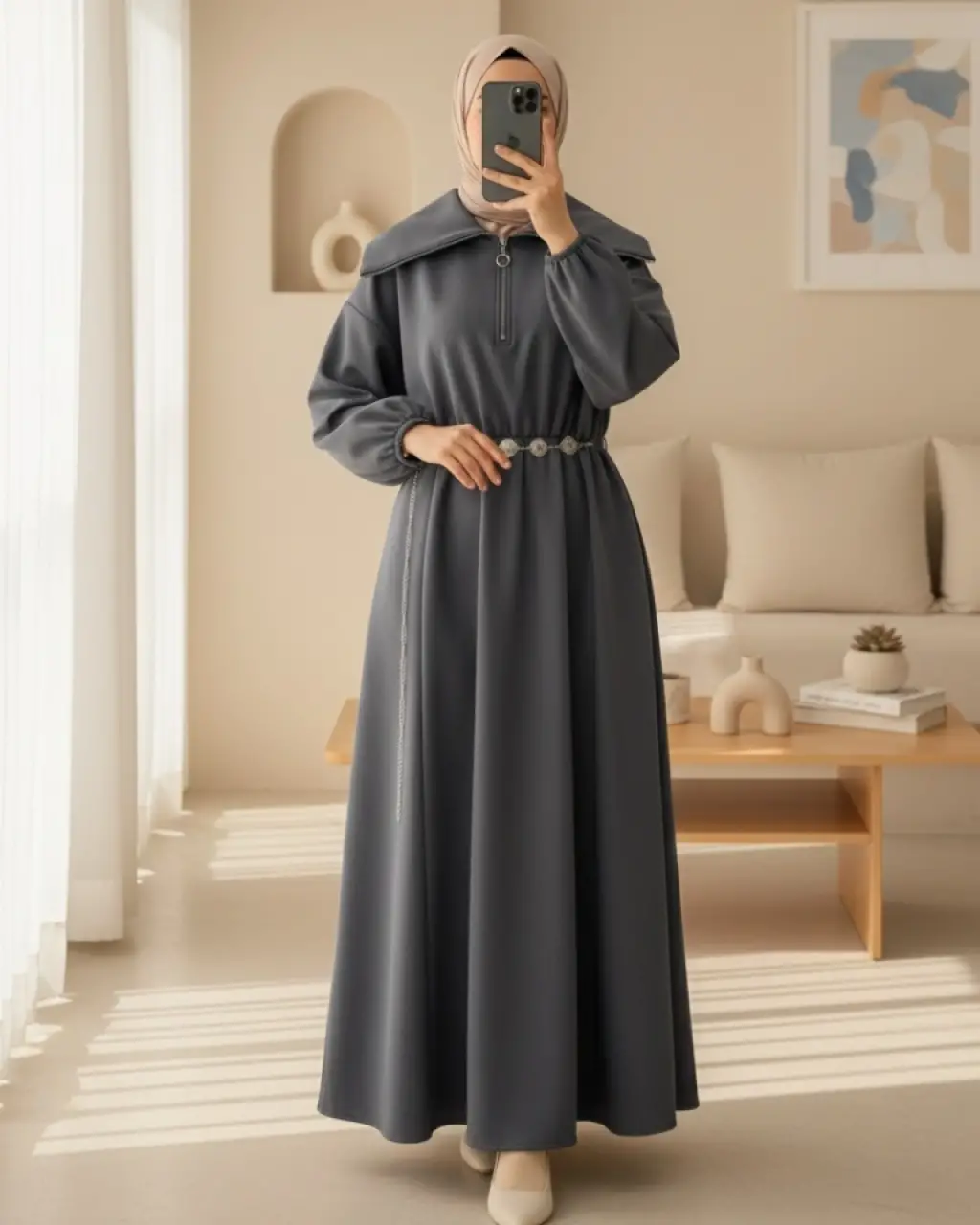 Boğazlı Yarım Fermuarlı Beli Büzgülü Kemerli Scuba Elbise -Füme