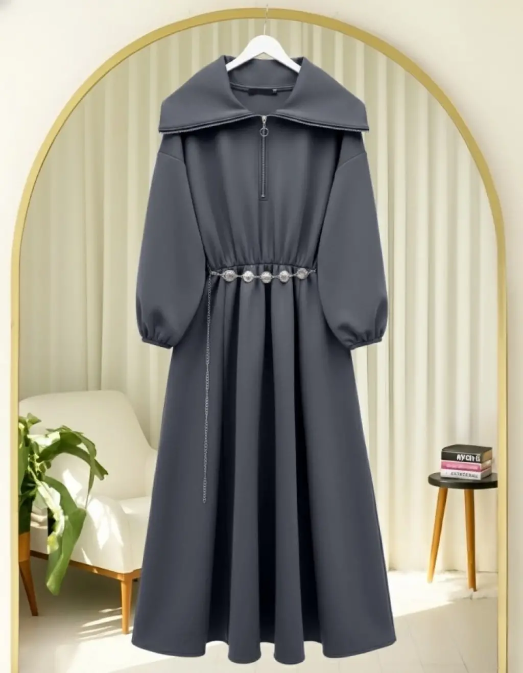 Kadın Uzun Kollu önden Fermuarlı Ithal Krep Elbise