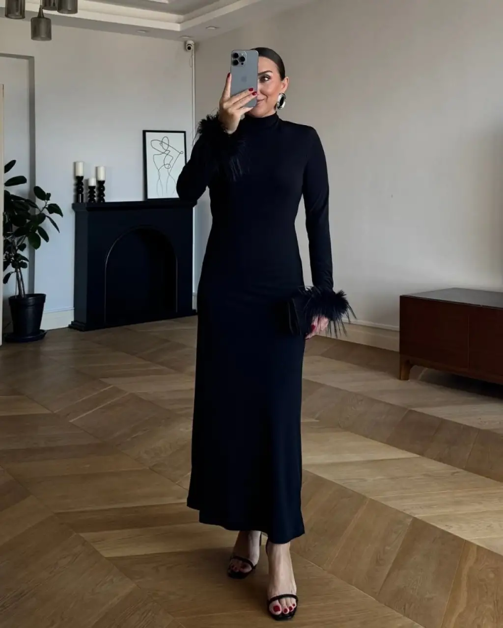 Kadın Uzun Kollu Balıkçı Yaka Kol Ağzı Tüy Detaylı Uzun Krep Elbise