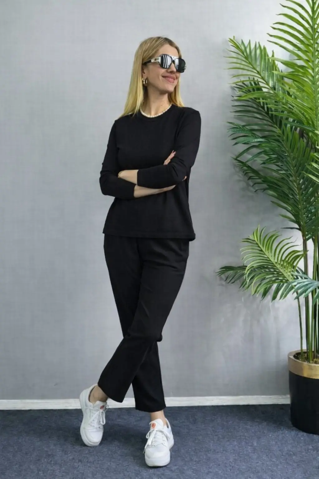 Kadın Uzun Kol Bisiklet Yaka Bürümcük Bluz Ve Pantolon Ikili Takım