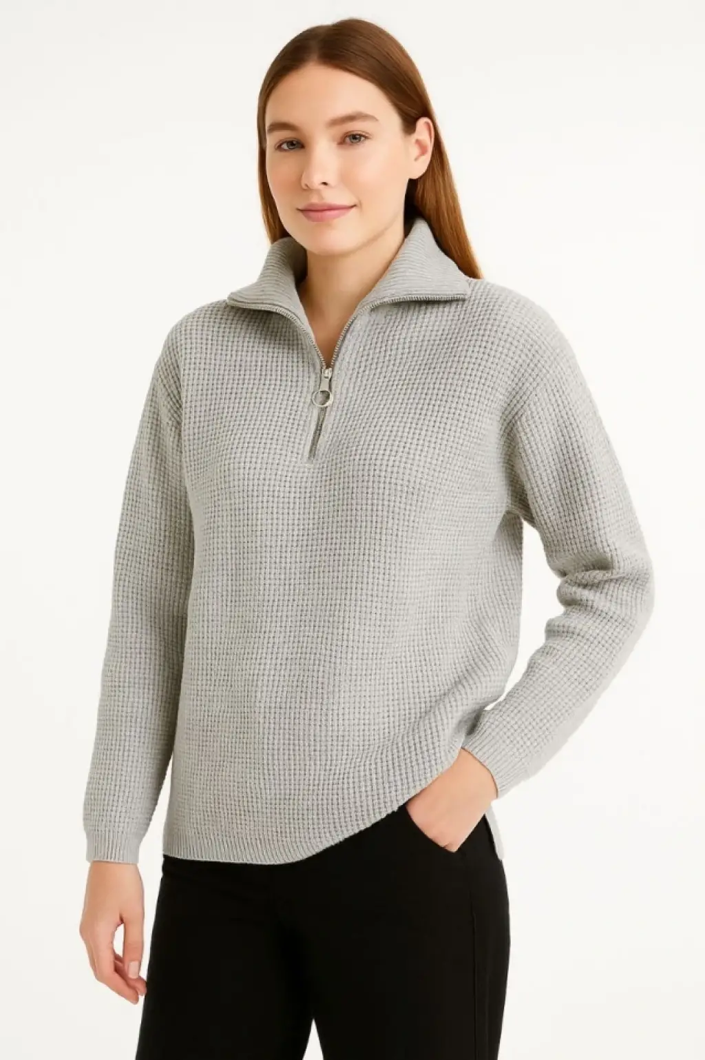 KADIN Yarım Fermuarlı Triko Kazak – Selanik Örgü, Dik Yaka, Pamuklu Dokuma, Regular Fit Uzun Kollu Kışlık Model - Gri