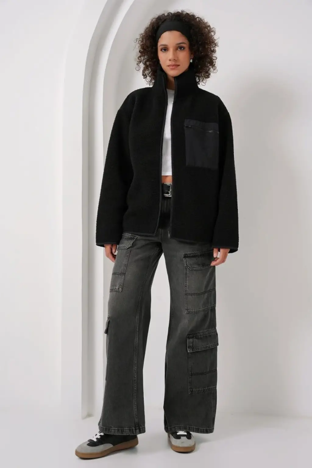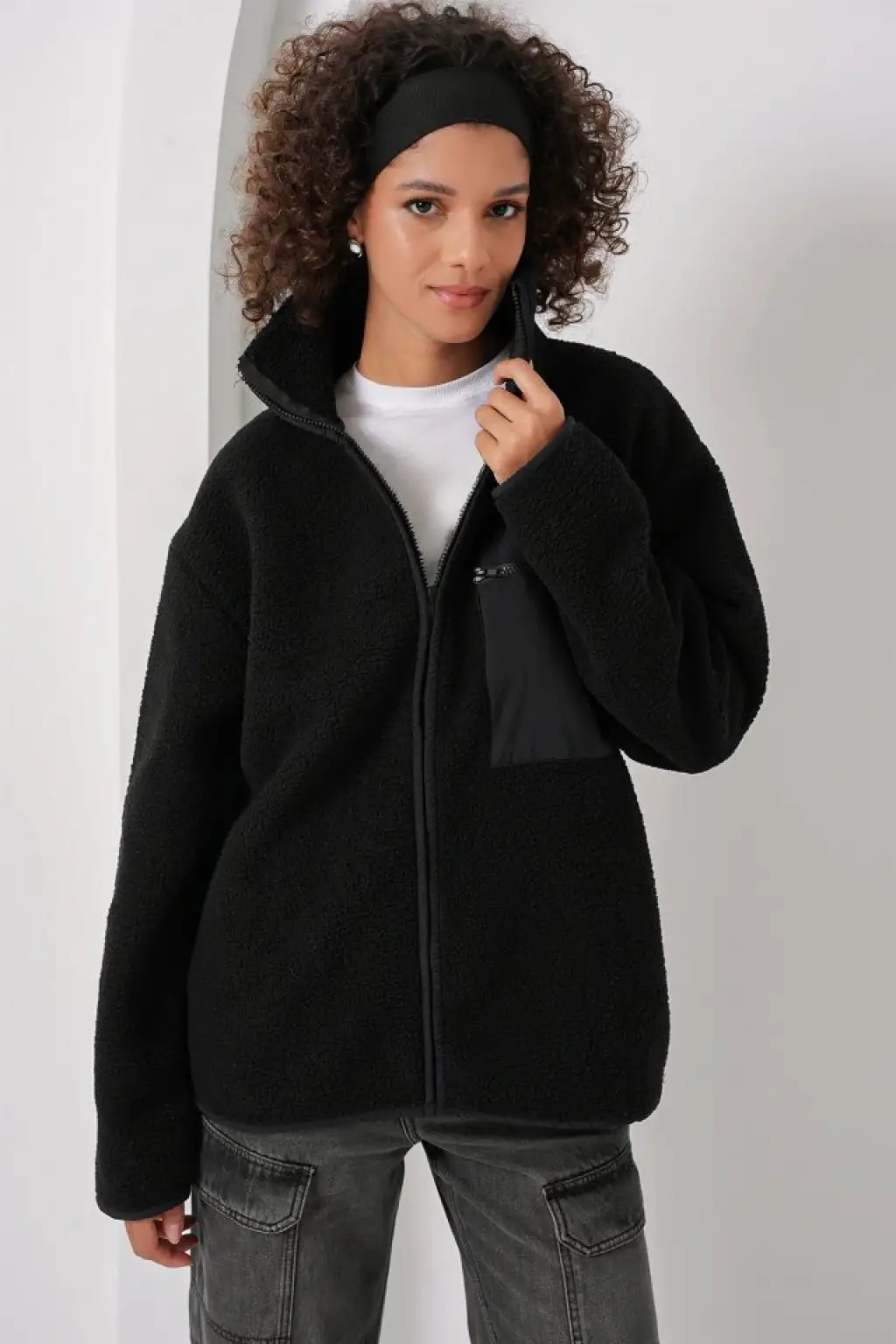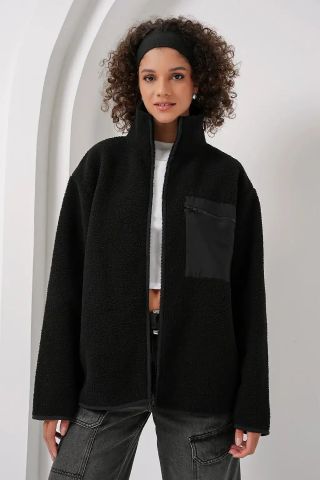 55446 Fermuarlı Oversize Peluş Ceket Mont - Siyah