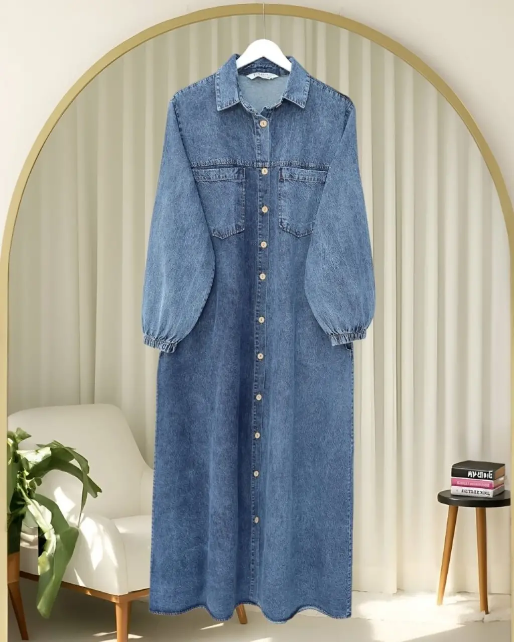 Boydan Düğmeli Kolu Lastikli Cepli Kot Elbise -Buz Mavi