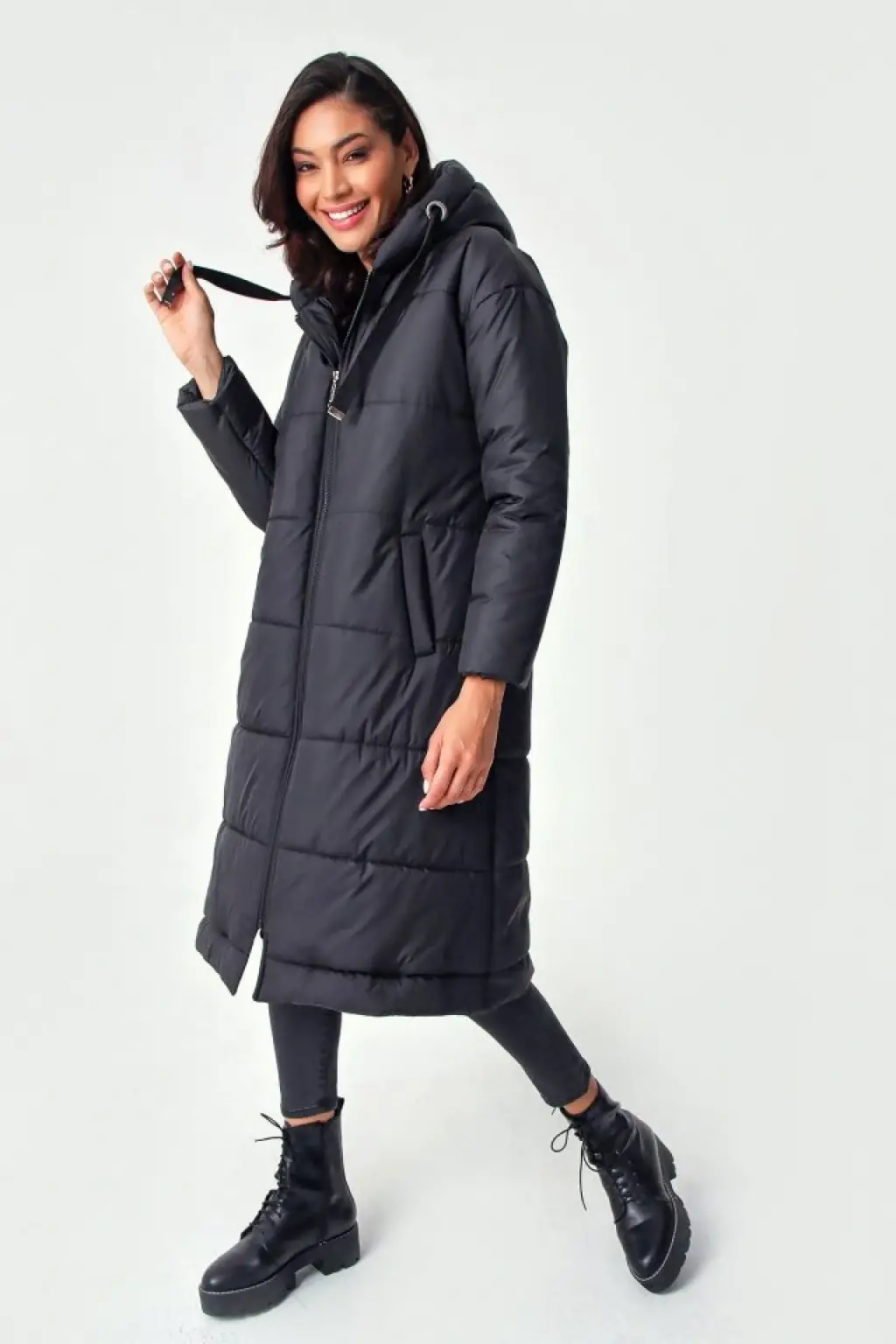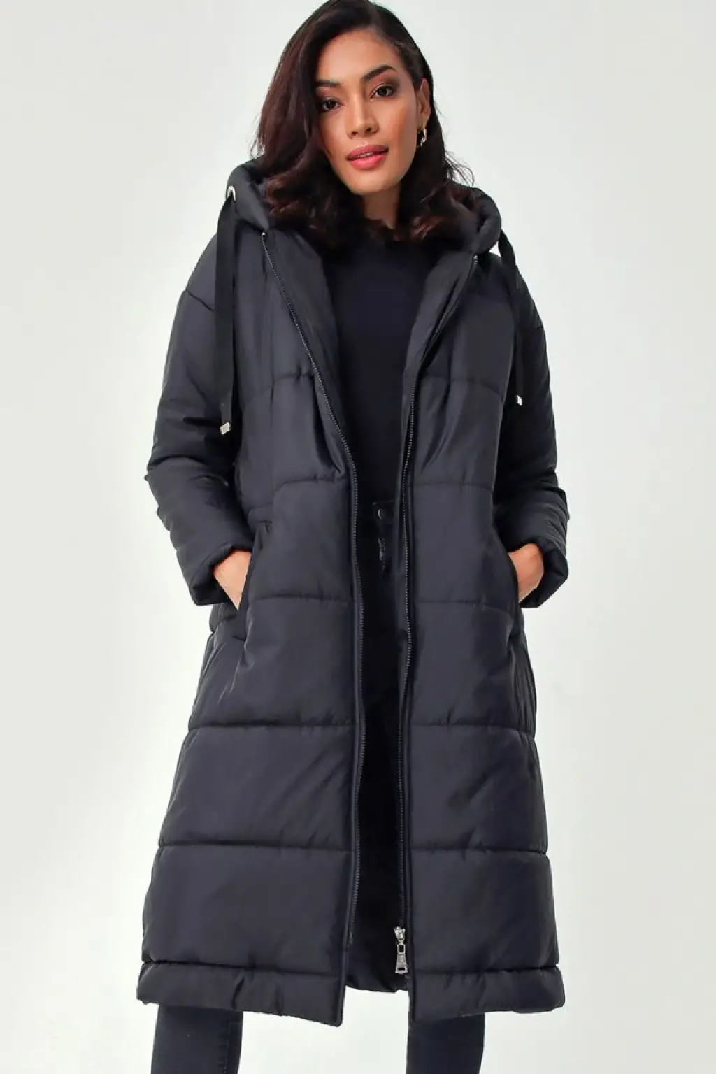 5120 Kapşonlu Uzun Şişme Mont - Siyah