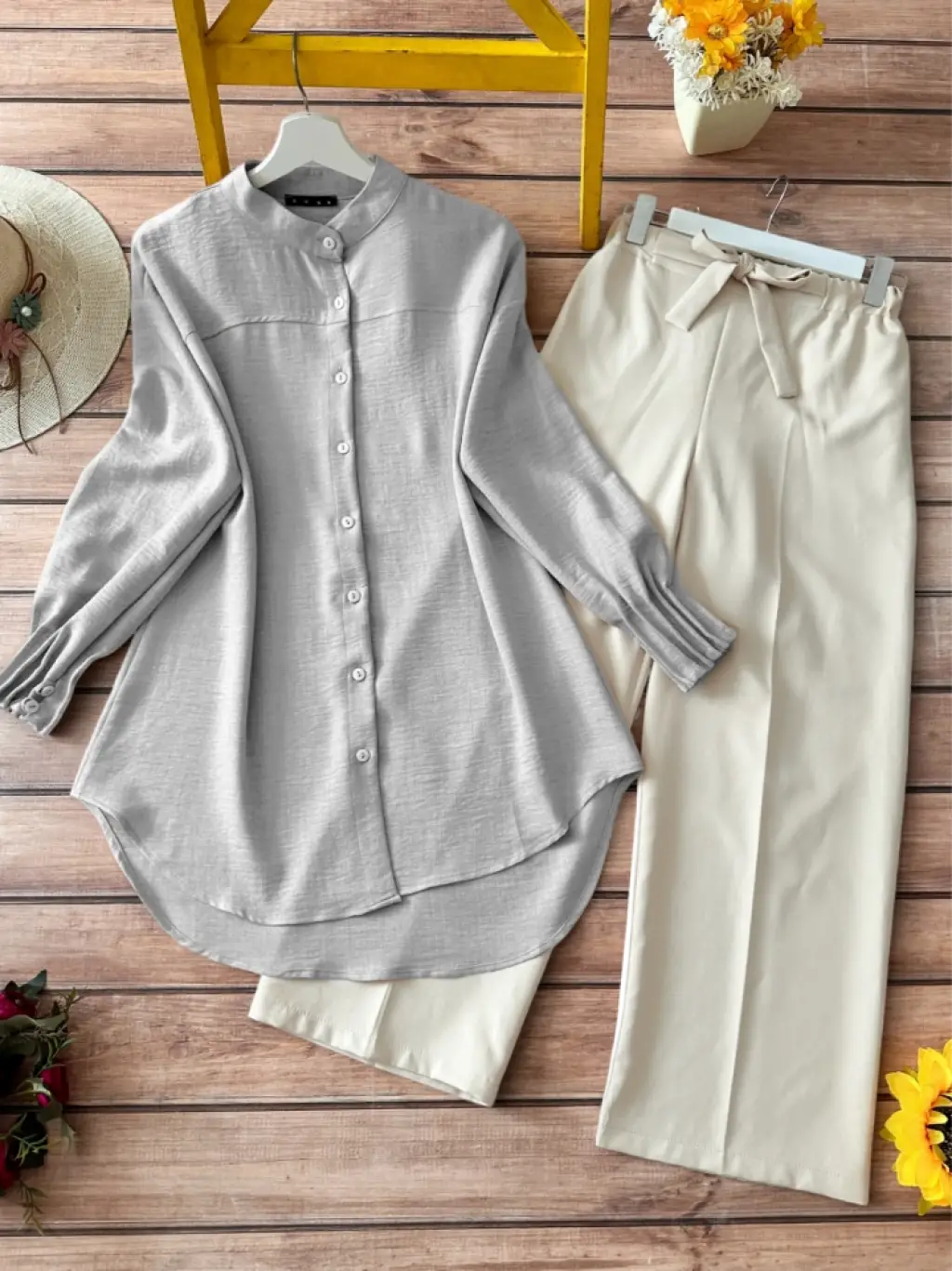 Kadın Uzun Kollu Salaş Gömlek Ve şort Keten Ikili Takım