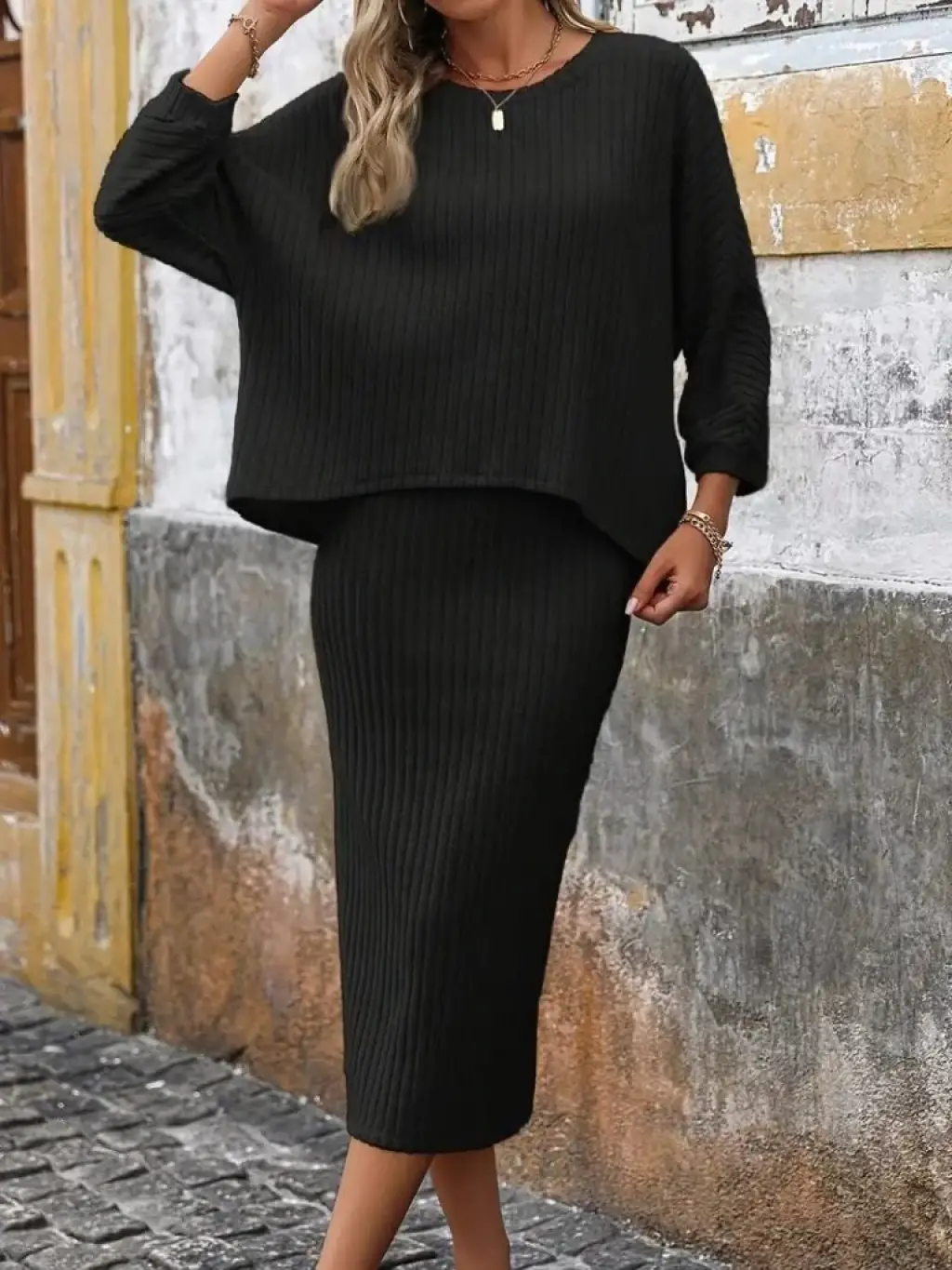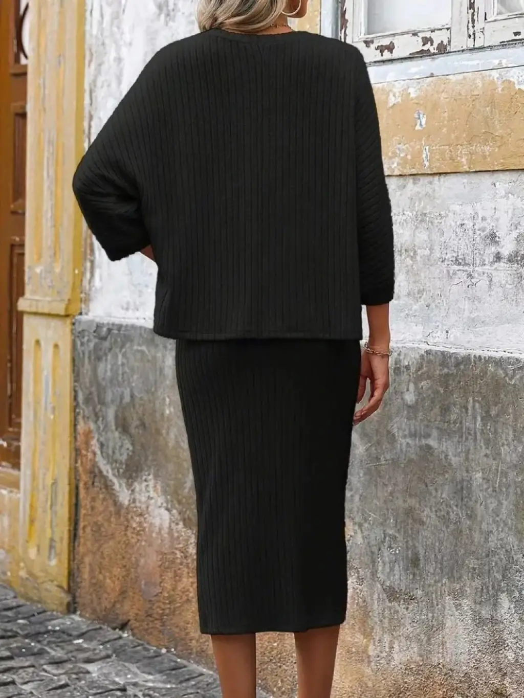 Kadın Uzun Kollu Kayık Yakalı Salaş Triko Bluz Ve Etek Ikili Takım