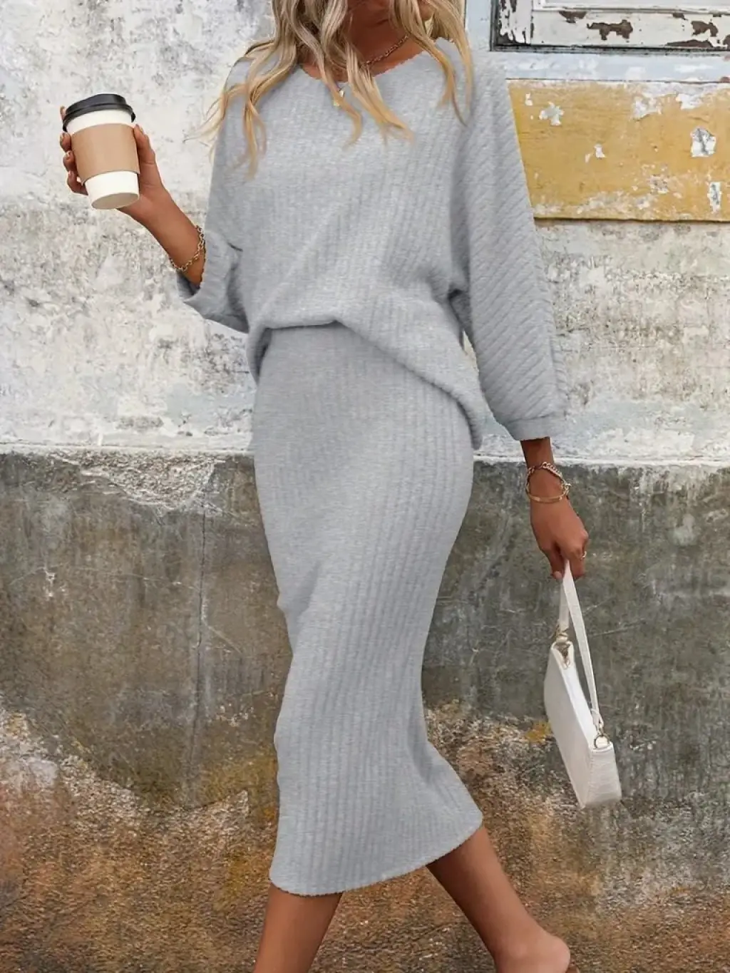 Kadın Uzun Kollu Kayık Yakalı Salaş Triko Bluz Ve Etek Ikili Takım