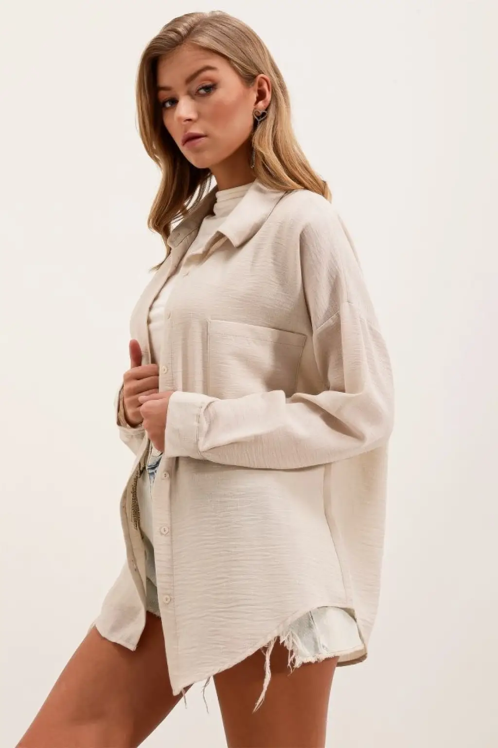 20153 Tek Cepli Oversize Keten Gömlek - Krem