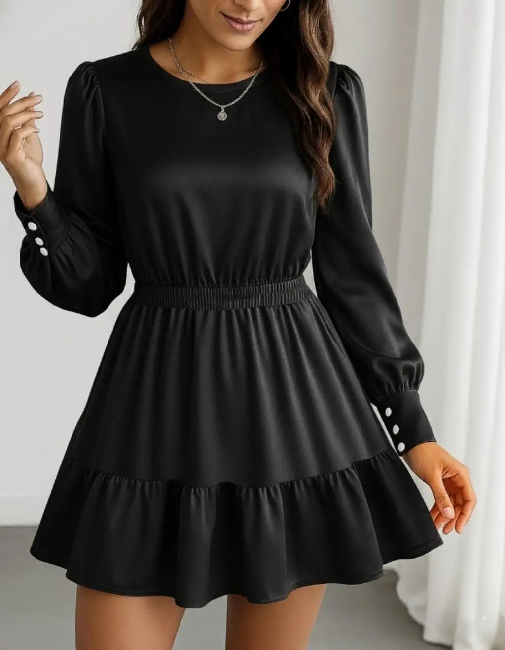 Kadın Uzun Kollu Bisiklet Yaka Beli Lastikli Fırfırlı Ithal Krep Elbise