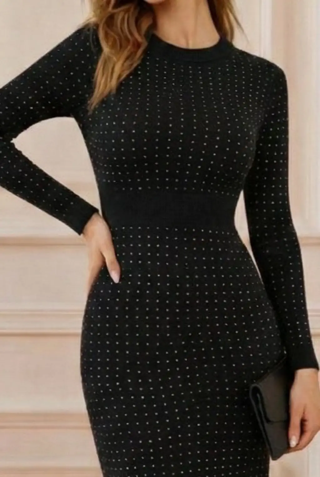 Kadın Uzun Kollu Bisiklet Yaka Taşlı Midi Kadife Elbise