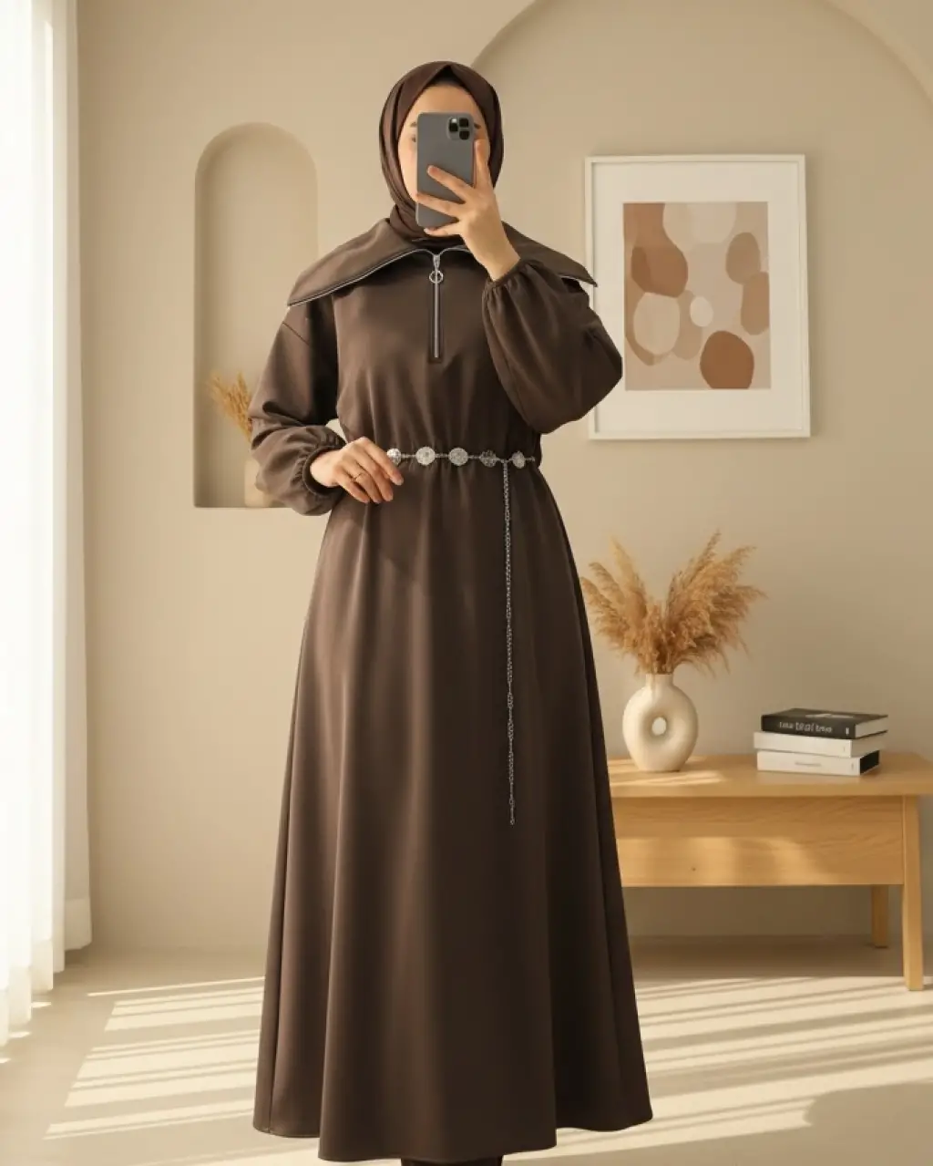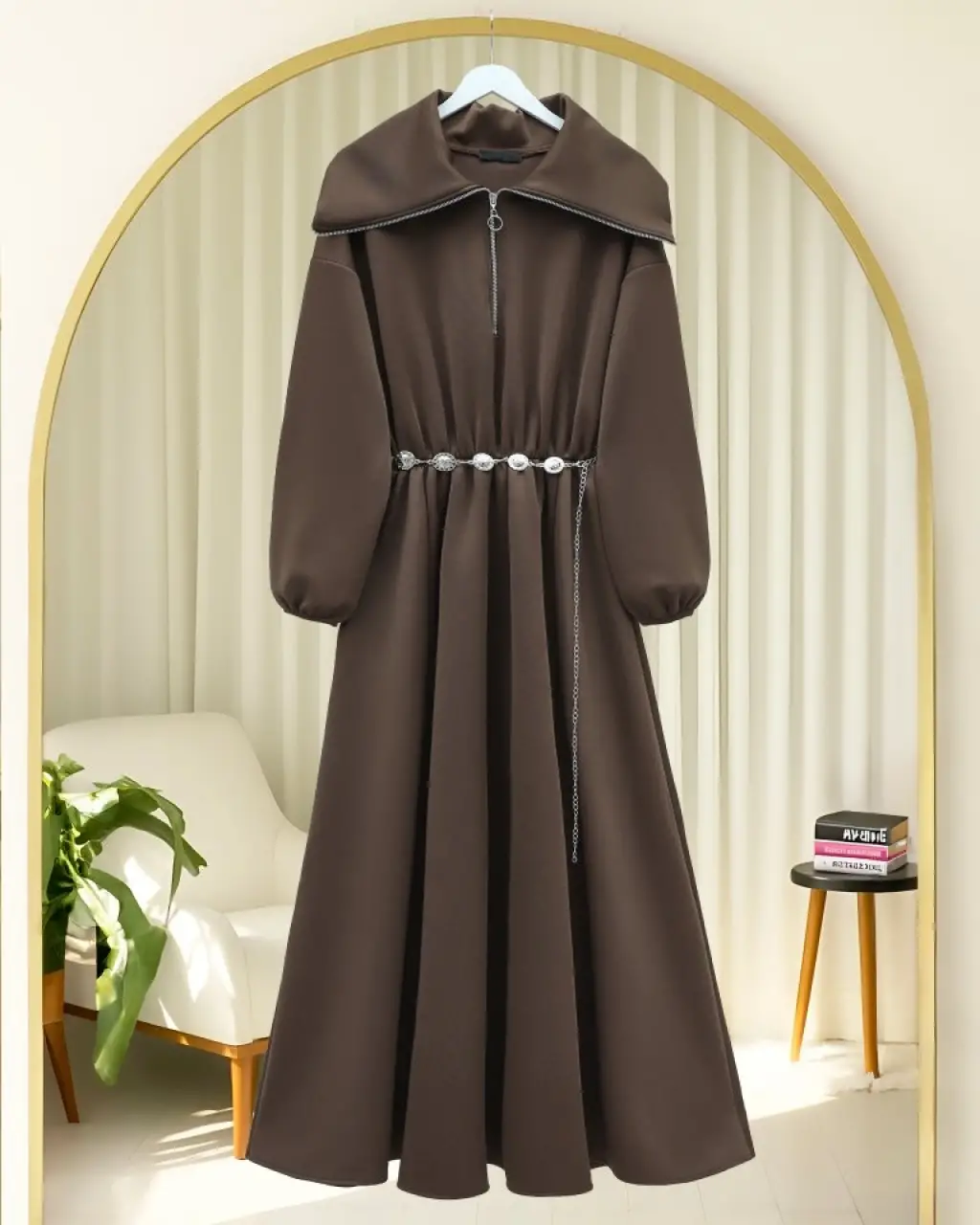 Boğazlı Yarım Fermuarlı Beli Büzgülü Kemerli Scuba Elbise -Kahve