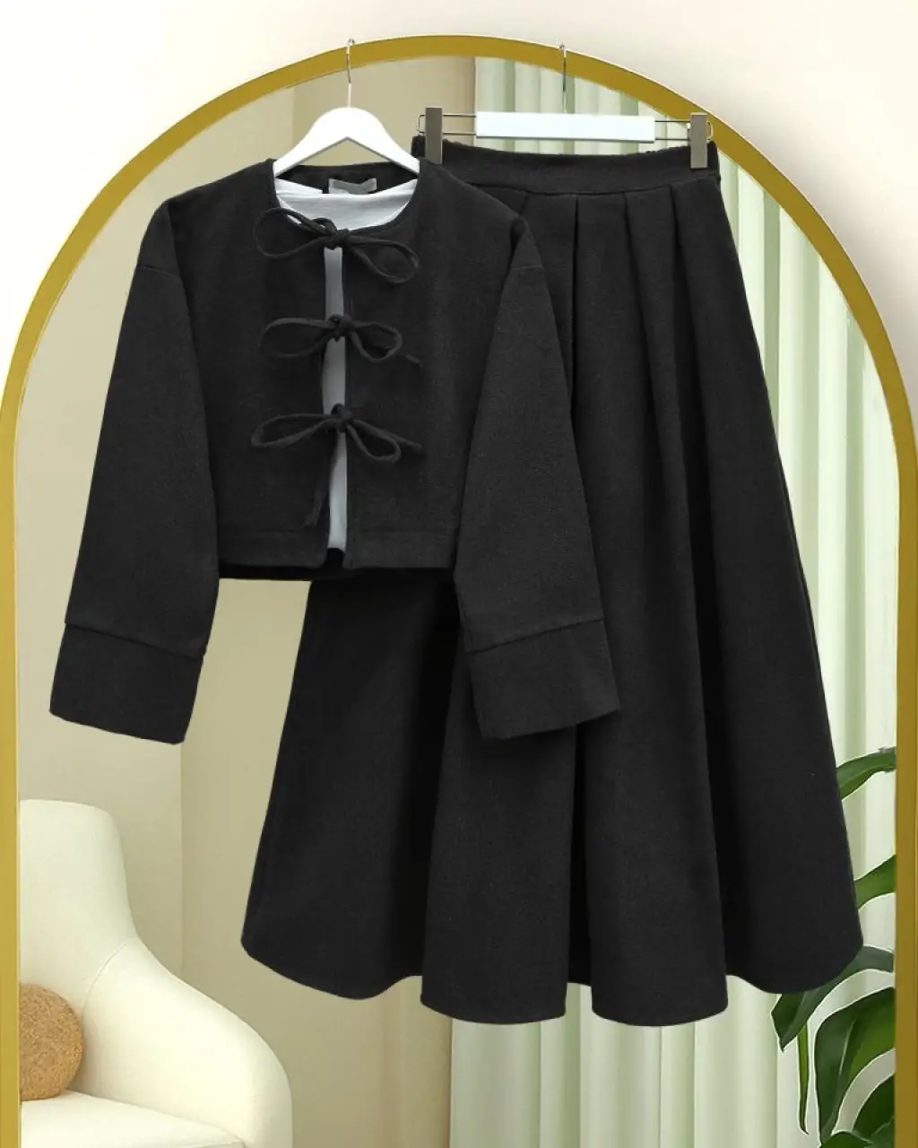 Önü Bağcıklı Etekli Kaşe Takım -Siyah