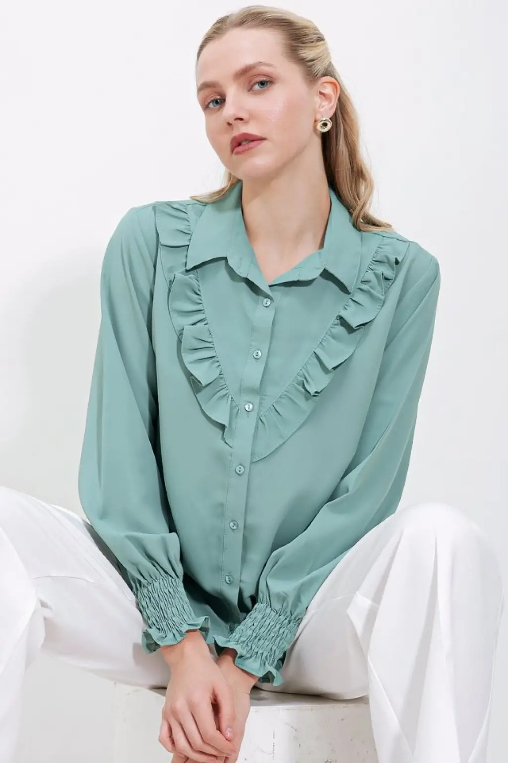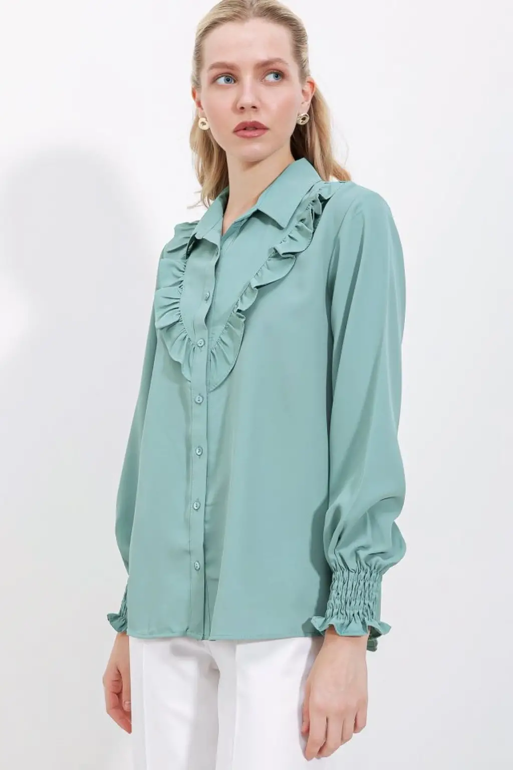 20223 Fırfırlı Uzun Kol Gömlek - Çağla