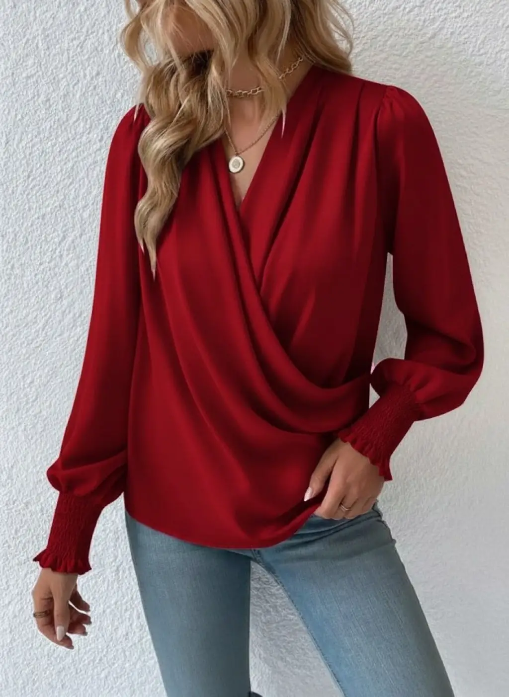 Kadın Uzun Kollu Dökümlü Kruvaze Yaka Kol Ucu Gipeli Sandy Bluz
