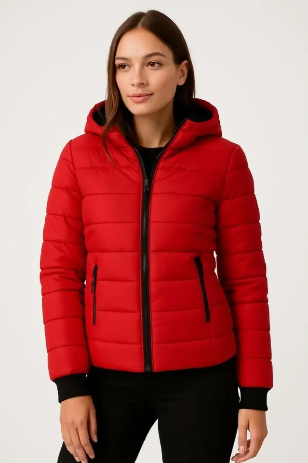 Kırmızı Şişme Kapüşonlu Fermuarlı Mont Kadın Giyim