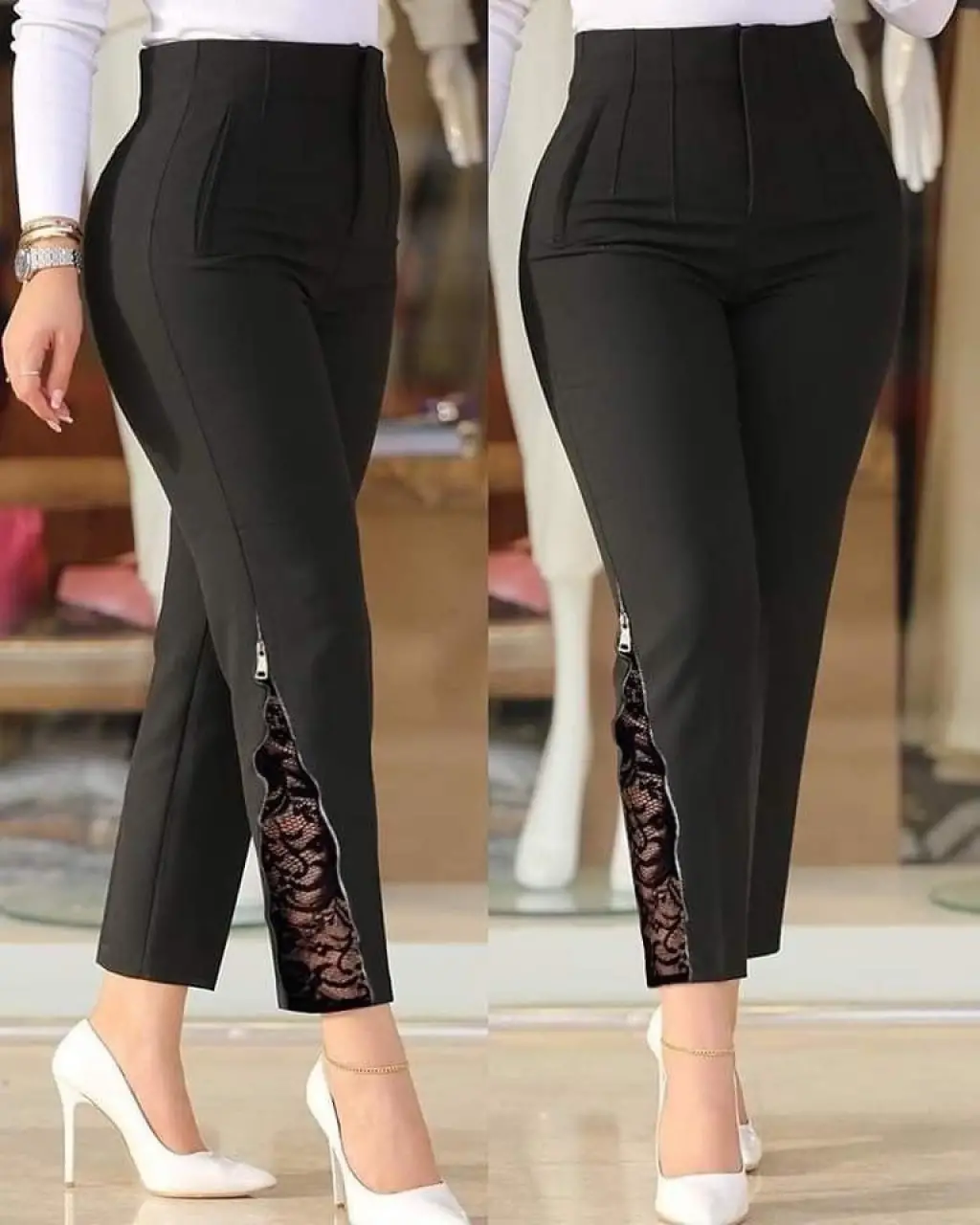 Kadın Yüksek Bel önden Nervürlü Ve Fermuarlı Yandan Dantelli Ithal Krep Pantolon