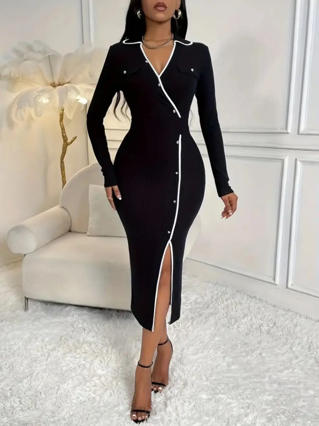 Modern Yakalı Yırtmaç Detaylı Uzun Elbise