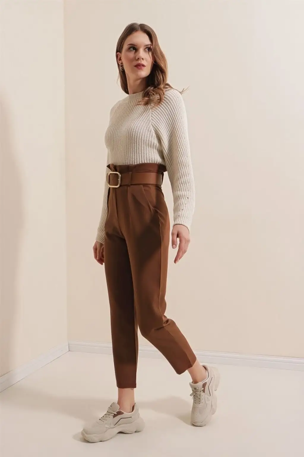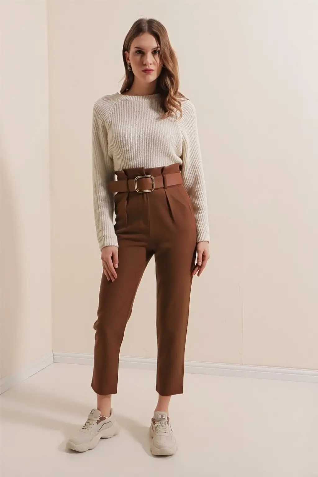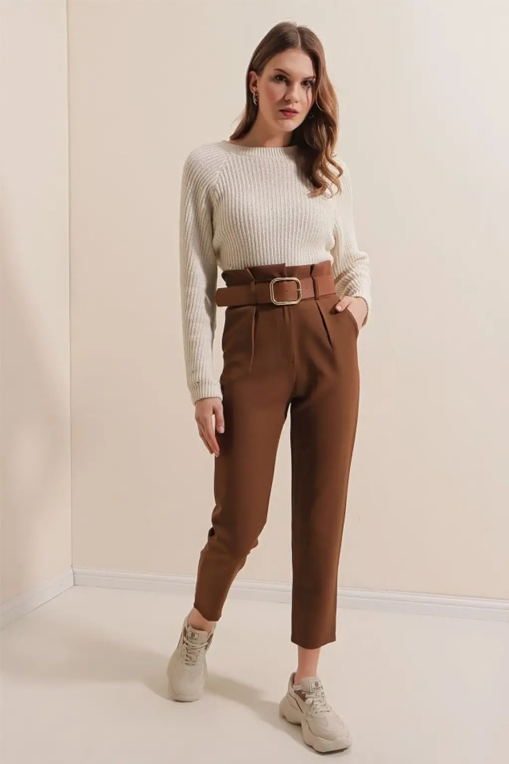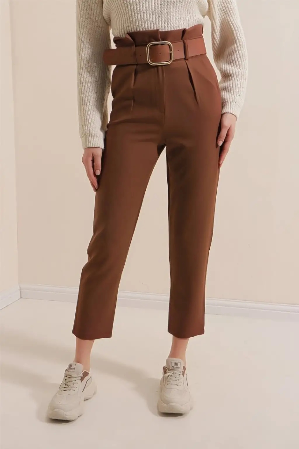6556 Kemerli Kumaş Pantolon - Kahverengi