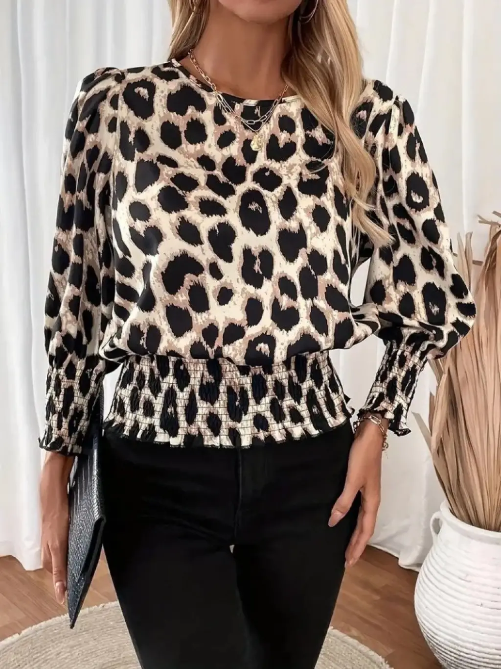 Kadın Uzun Kollu Bisiklet Yaka Leopar Desenli Modal Bluz