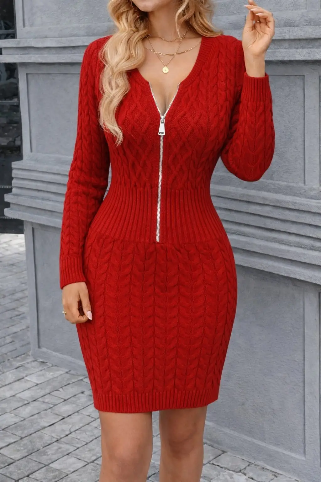 Kadın Uzun Kollu V Yakalı önden Fermuarlı Kısa Triko Elbise