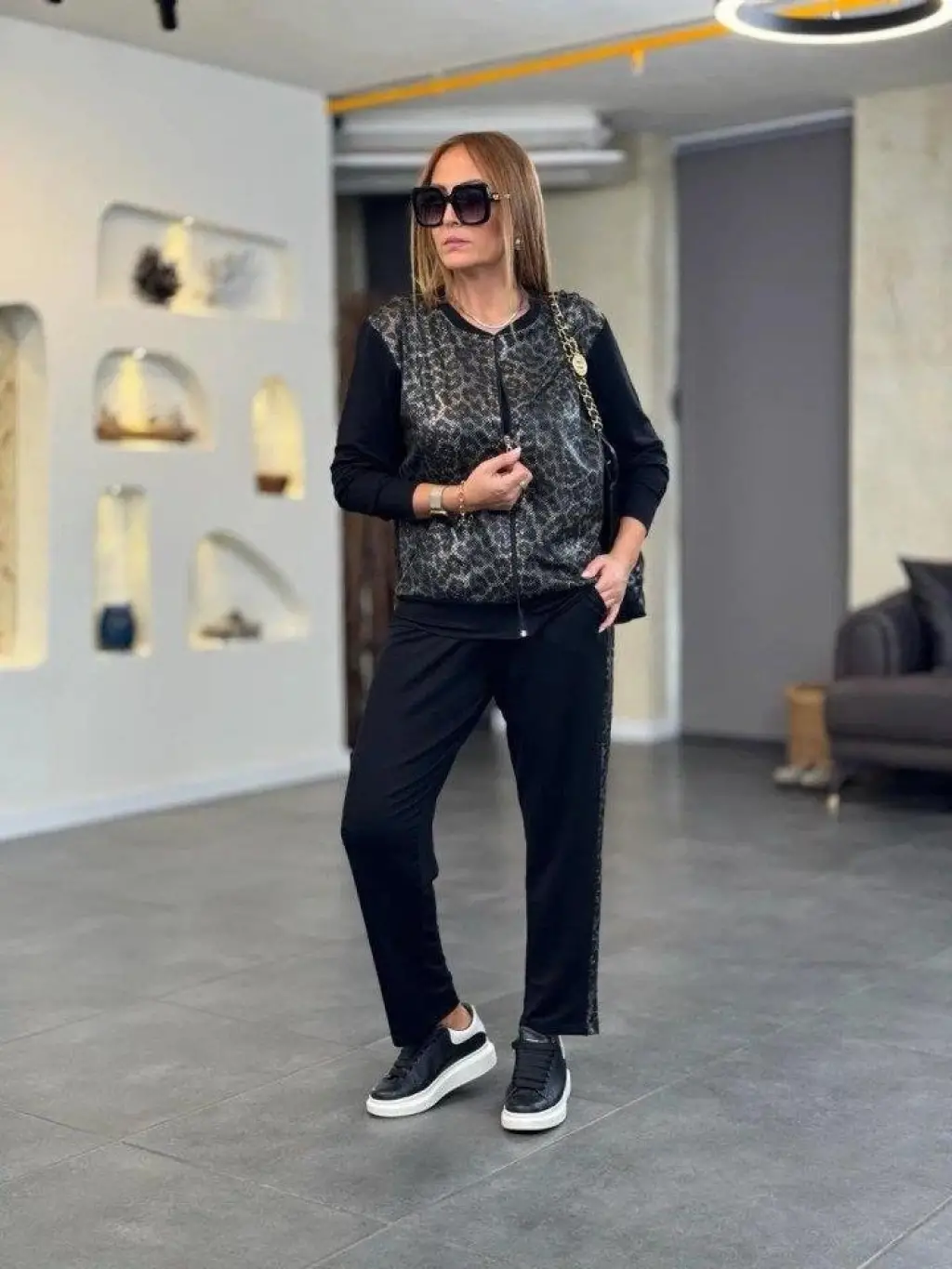 Kadın Uzun Kollu önden Fermuarlı Leopar Desenli Viskon Iki Iplik Bluz Ve Pantolon Ikili Takım