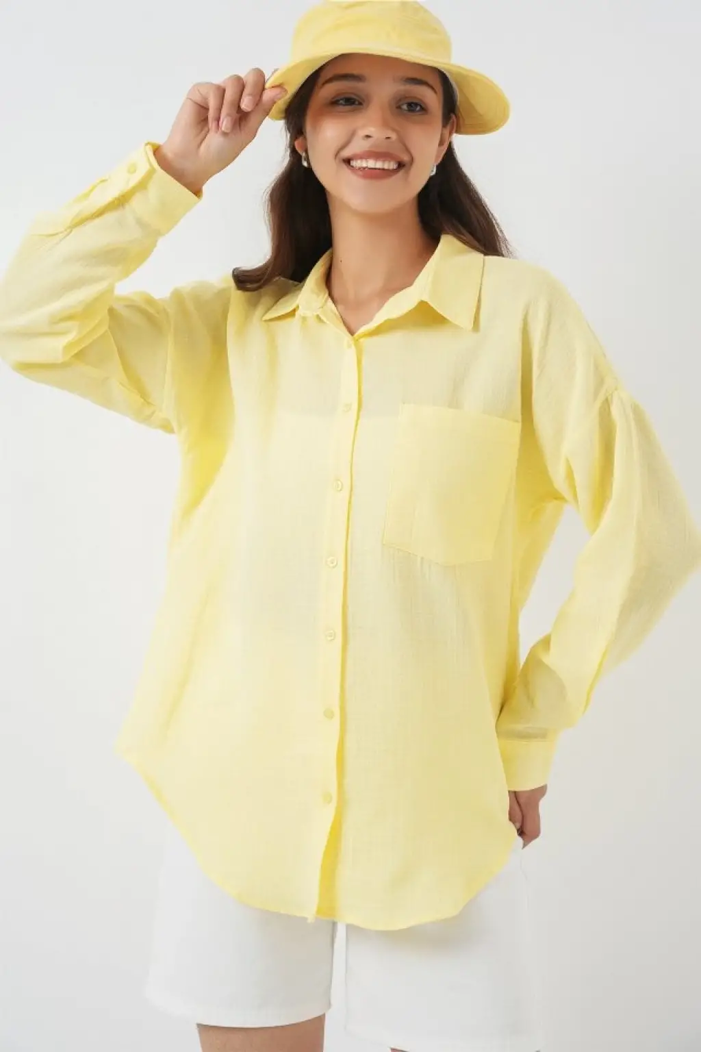 20153 Tek Cepli Oversize Keten Gömlek - Açık Sarı