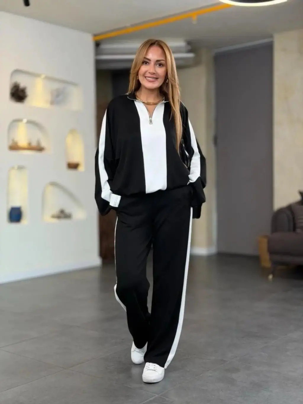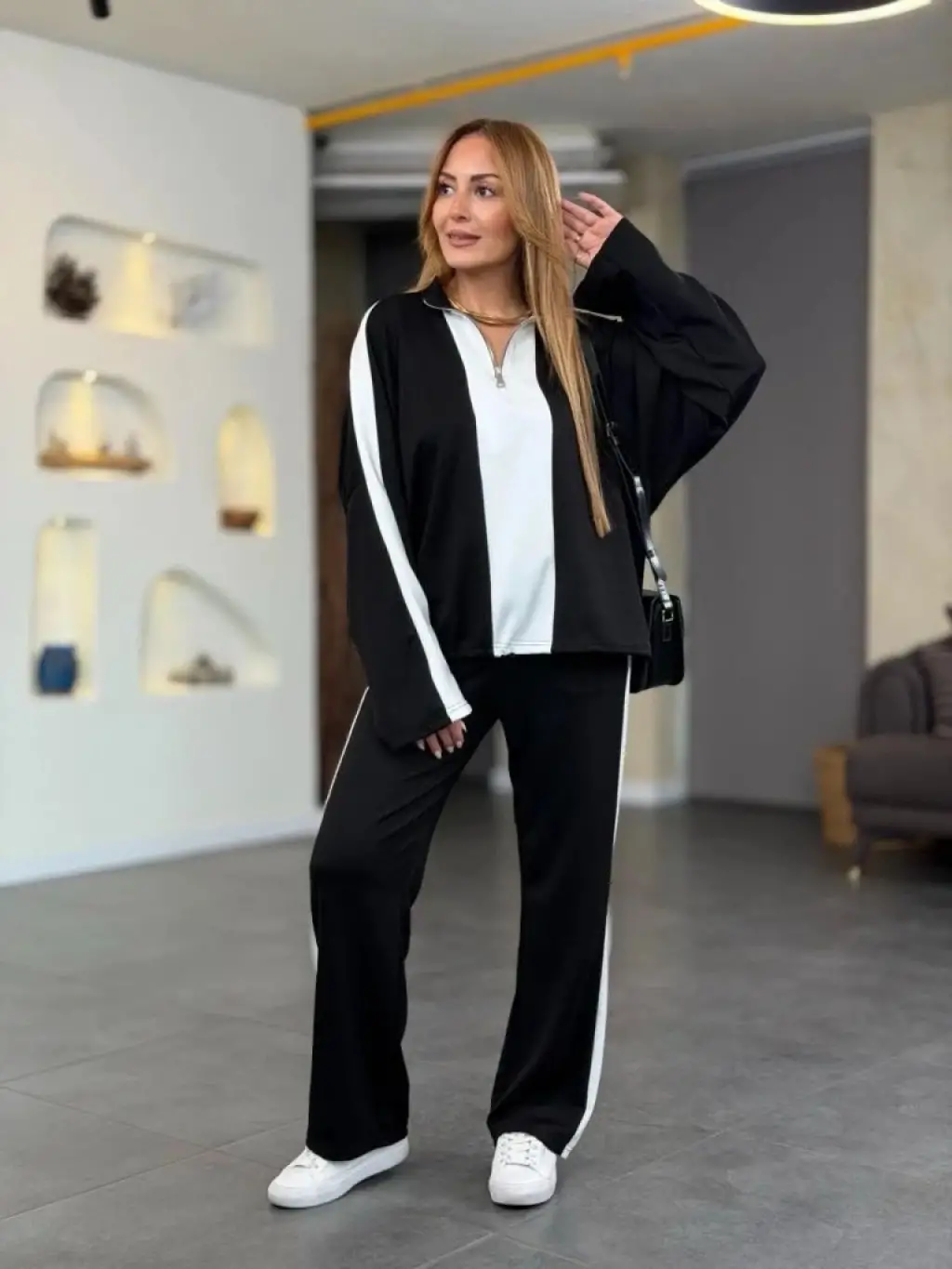 Kadın Uzun Kollu Yakadan Fermuarlı Viskon Iki Iplik Bluz Ve Pantolon Ikili Takım